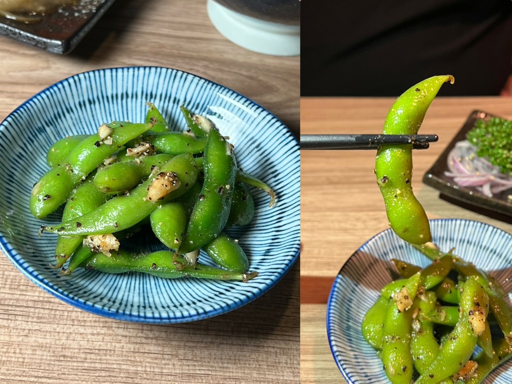 暮樂町居酒屋首先端出,清爽多汁的開胃小菜,這個蒜香毛豆蠻入味的,胡椒微微辣度可刺激味蕾,等候餐點上桌前也不怕無聊沒東西,邊嗑毛豆邊閒聊,沒多久餐點就陸續上桌