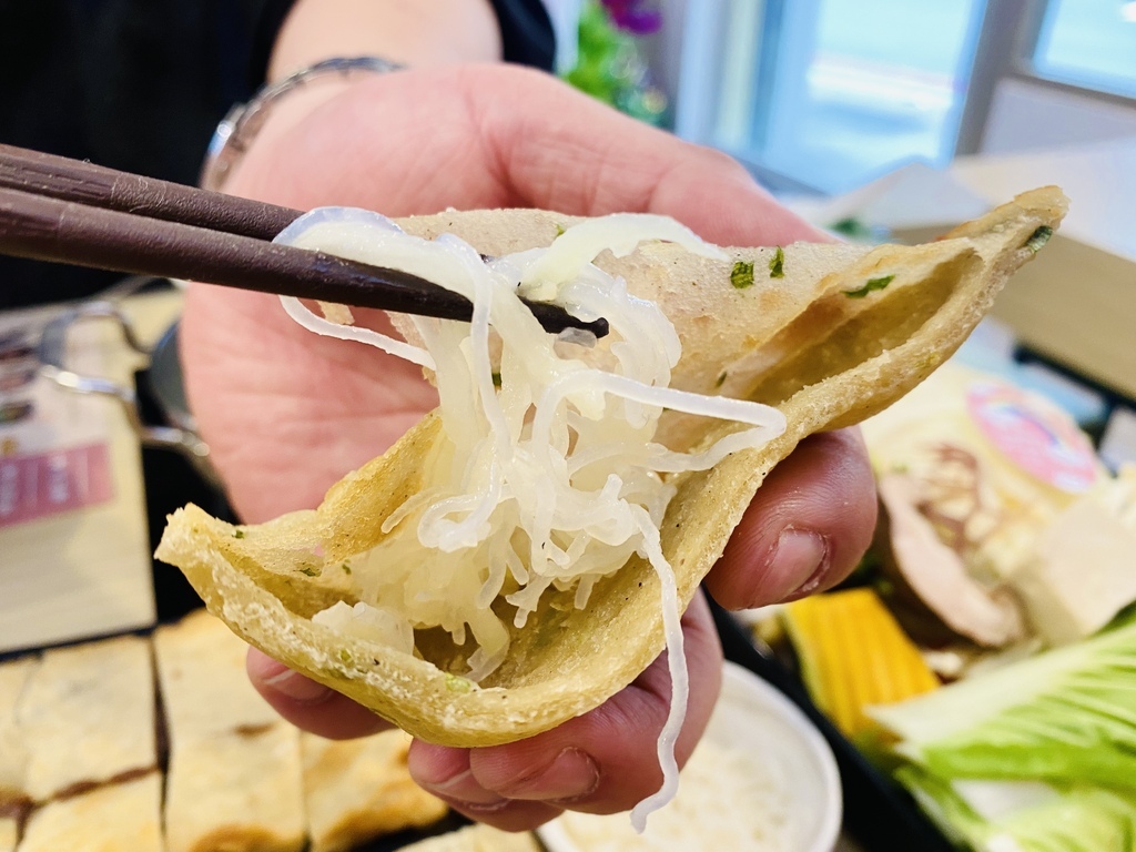 老饕吃法就是要用蔥油餅包覆冬粉絲一起吃,