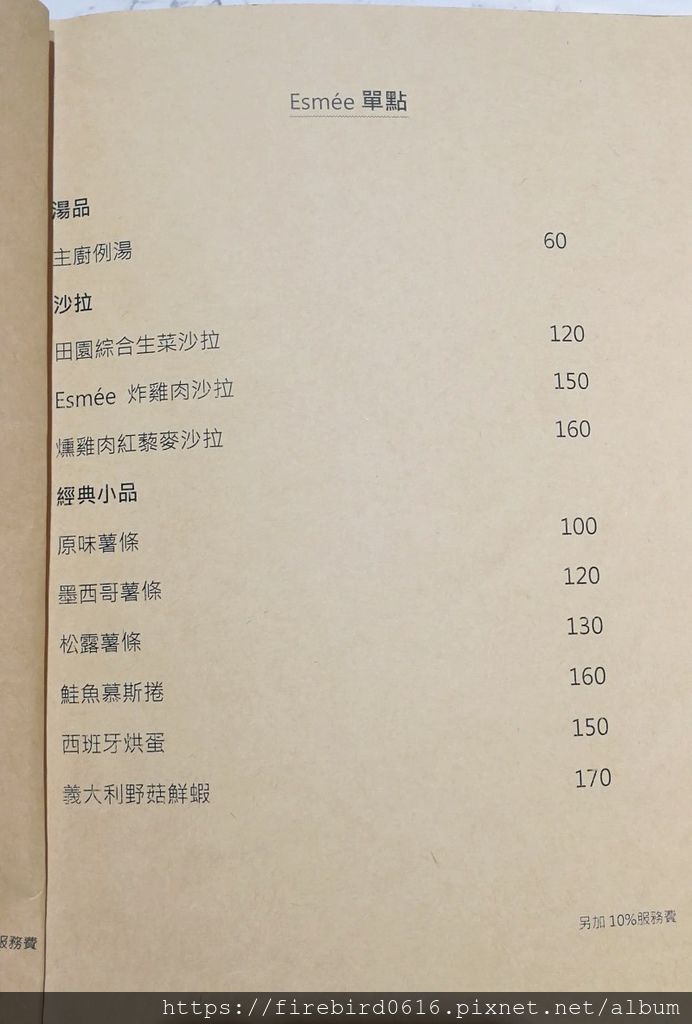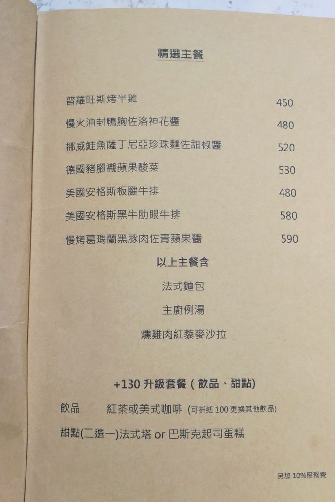 主餐價格500上下,價位中等,排餐都有附法式麵包和主廚例湯和燻雞沙拉,加130元可以升級套餐,可選基本甜點/飲料,也可選擇其他飲料可折100元。