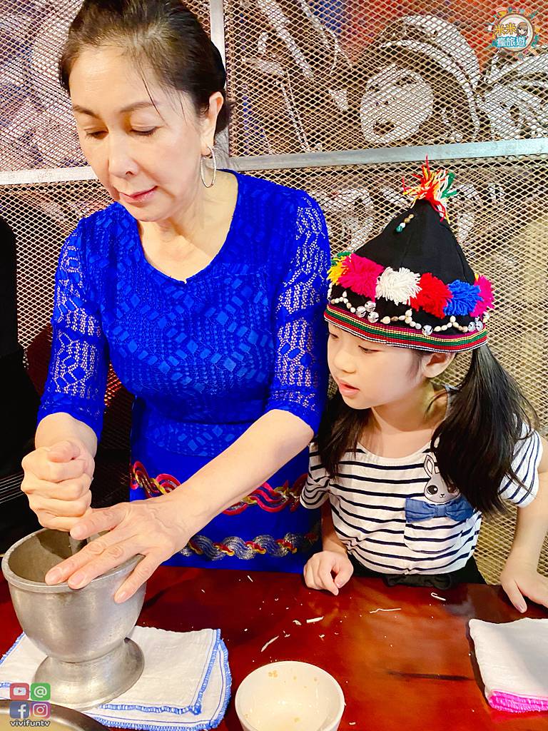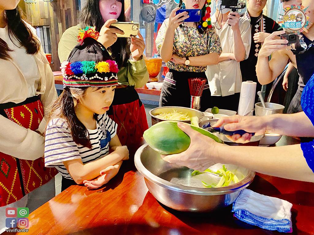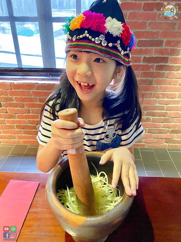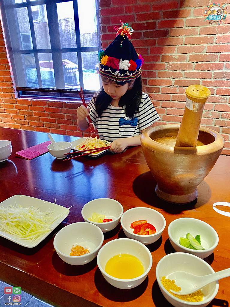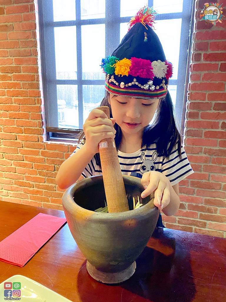 親手體驗泰式涼拌青木瓜絲,品嚐酸、辣、清爽的涼拌小菜,米安啾先是認真的觀察老師的教學,然後實際體驗,從蒜頭、蝦米、辣椒、木瓜絲、魚露、花生粉,不只認識了食材及香氣,經過自己親手試做後,也勇敢的品嚐酸辣口感,然後再努力喝水,哈哈哈!相信小一新生的她永生難忘這堂南洋食堂課。