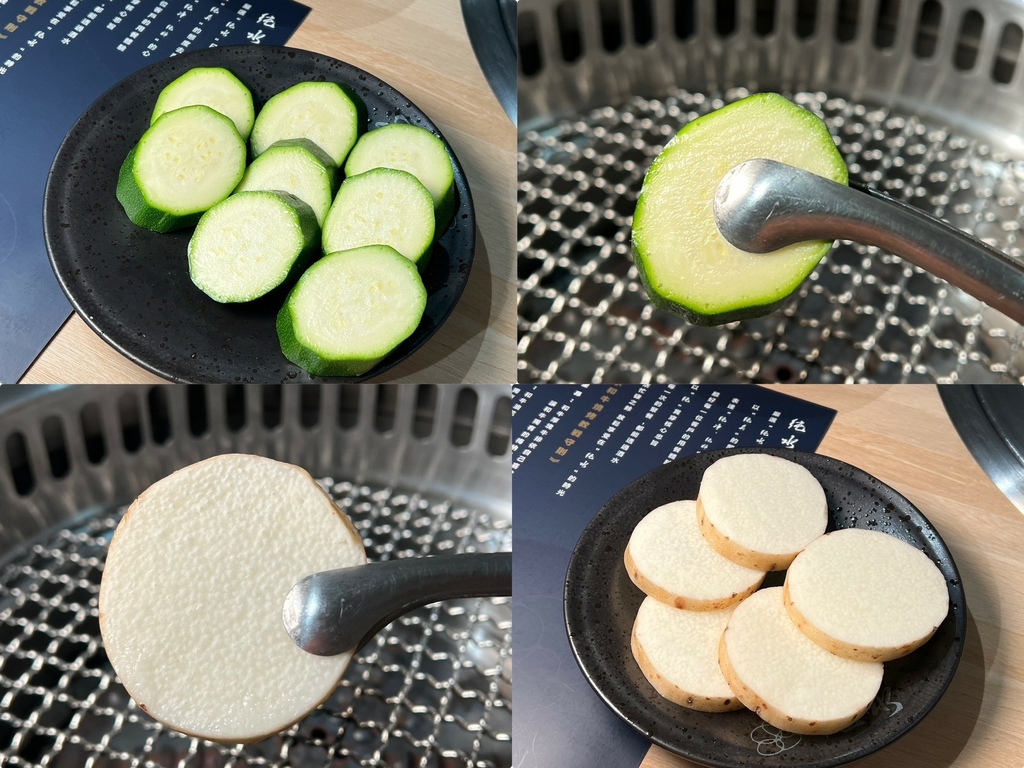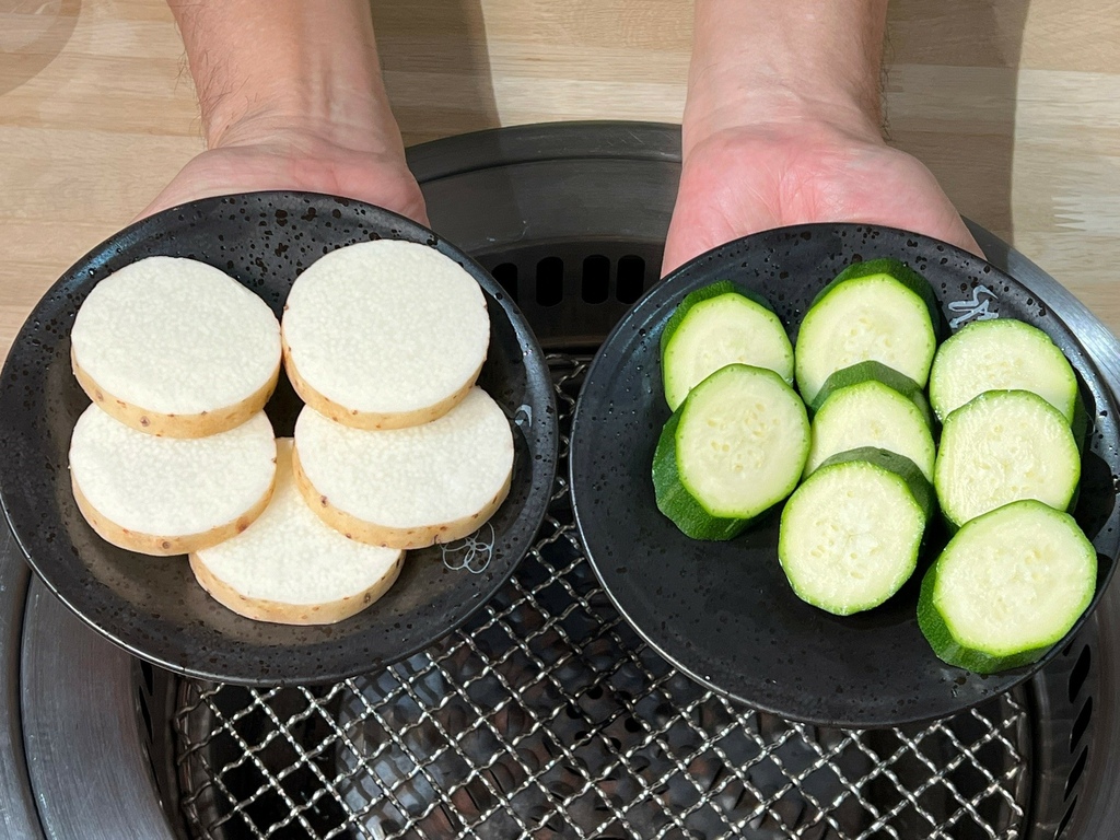 純水燒肉的食材樣樣都是精挑細選,超高品質,看看這蔬菜切得好漂亮,透過烤爐的輻射烤透,避免蔬菜的水份流失~