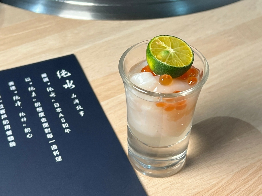 超有創意的干貝SHOT在REELS好高人氣,底下是柚子酒,淡淡的果香,更能襯托出干貝及魚卵的鮮,一大口SHOT掉超滿足