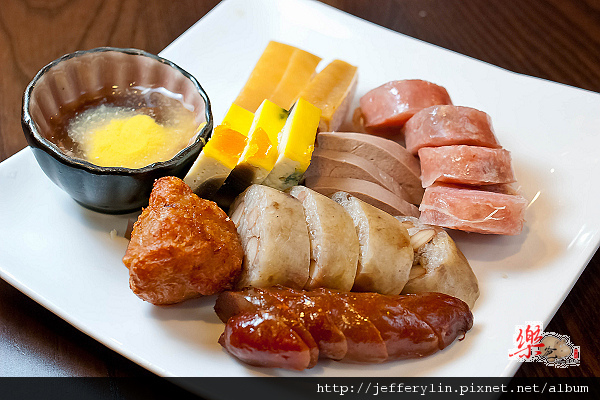 接著上桌的是樂媽的最愛~"香腸熟肉綜合切盤", (如上圖), 裡面有香腸、米腸、粉肝、三色蛋、鯊魚煙以及類似蝦捲的炸物? 整盤來說, 也是很好吃的一道料理, 特別是沾上那特製的沾醬, 別有一番滋味!