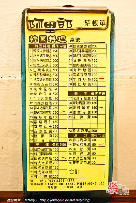 不過, 上面只是說到了韓國人愛這, 那樂爸呢? 當時, 樂爸一開始也沒什麼特別的感覺, 經這些韓國同事介紹了一下, 像是"韓式素菜(蔬菜)拌飯"、"韓式石鍋拌飯"、"烤肉"、"煎餅"、"年糕", 還有就是"炸醬麵"...等等都還不錯, 而經過了這麼久的時間, 還蠻懷念這裡的味道, 所以就找了一天帶著樂媽與阿成來追憶當時的時光囉! 不過, 都六、七年了, 老闆娘的中文似乎沒什麼進步? 還是會結結巴巴的~呵呵呵, 而我們只有二大一小, 也點不了太多東西, 但實在想點的很多, 所以今天就點了一份"韓式海鮮煎餅"、一碗"炸醬麵" 、一份"韓式烤肉飯"、一份"炒飯"及一碗"韓式鱈魚湯", 並附上菜單供各位參考, (如上圖)。其實最後還是很多沒吃完都打包回家了。