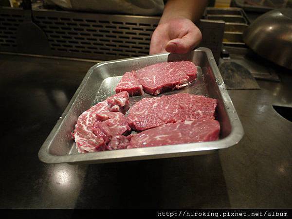 接著師傅準備開始料理安格斯肋眼牛排,可以看到油脂分布均勻,大理石紋很多,其實只要拿捏火侯得宜,不用多加調味就可以享用