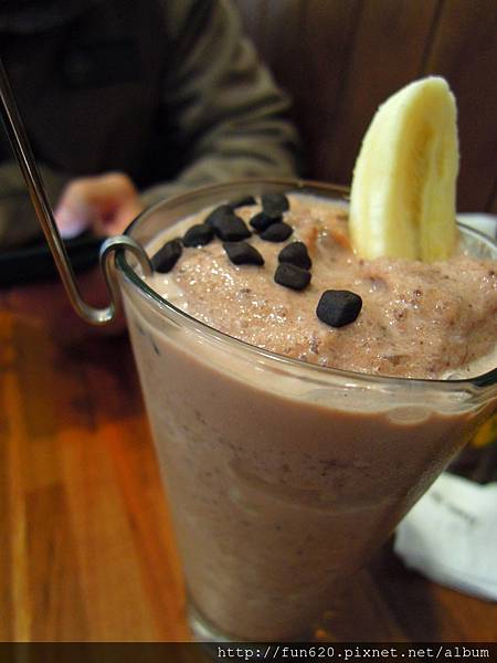 牛奶巧克力冰沙,叉進半根香蕉,灑上幾顆巧克力豆。