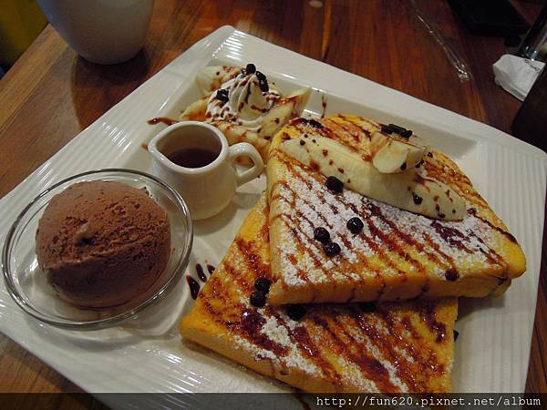 一球香草冰淇淋,一球是剛才一樣好吃的巧克力冰淇淋。兩邊各一球鮮奶油,底下躺著兩半條香蕉。然後這是鬆餅。老實說我覺得搞的有點像一個人躺在鬆餅上─..─