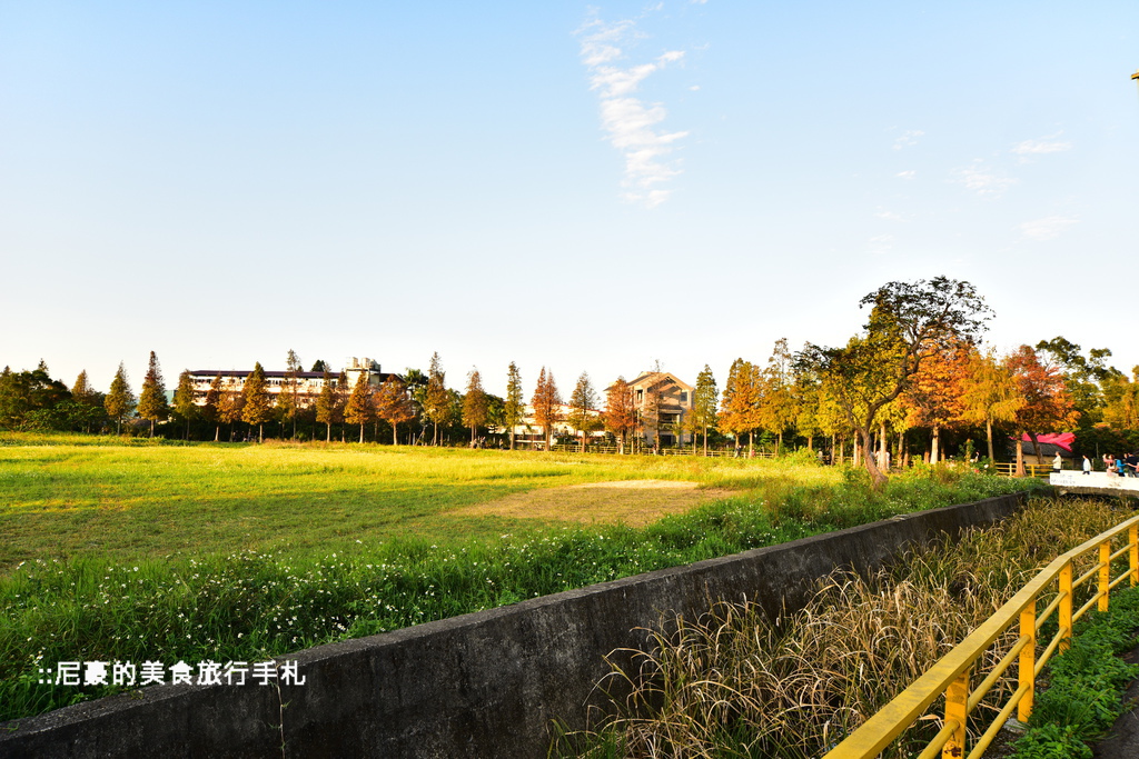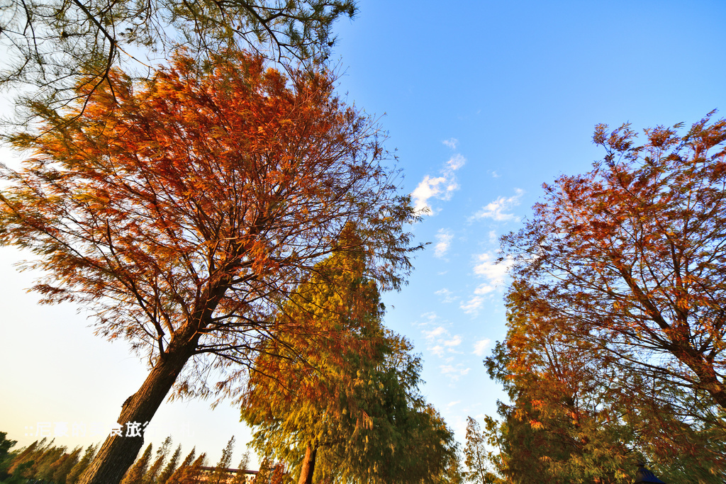 在夕陽之下,落羽松呈現出豐富的色彩,彷彿有置身國外的風情