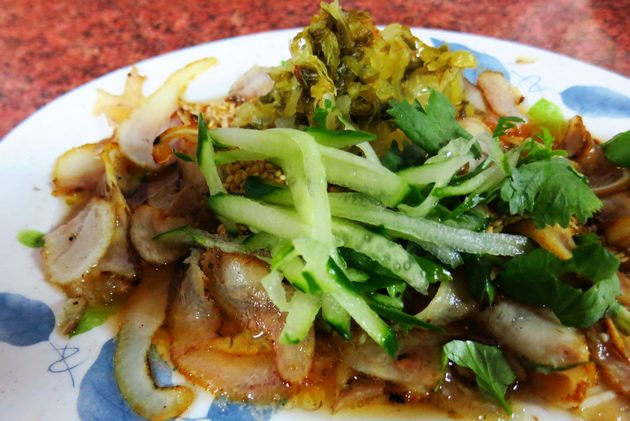 拌上大蒜、雲南水醃菜...等八種香料,上桌前灑些酸菜和小黃瓜絲,那微焦的肉香,妙啊!