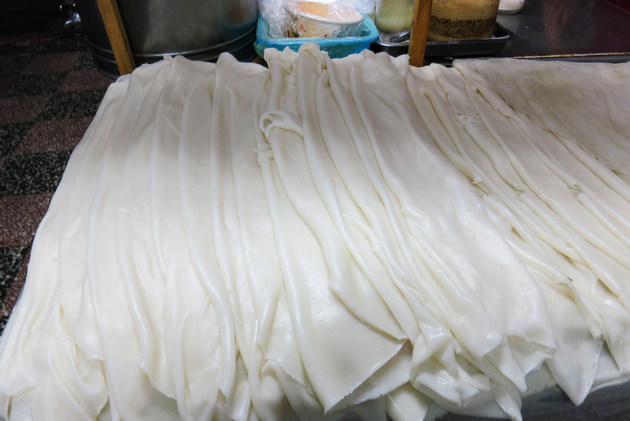 〔國旗屋〕的米干,數十年來,始終堅持用純米當天現做:米漿蒸熟成粉皮後,竹竿晾掛。