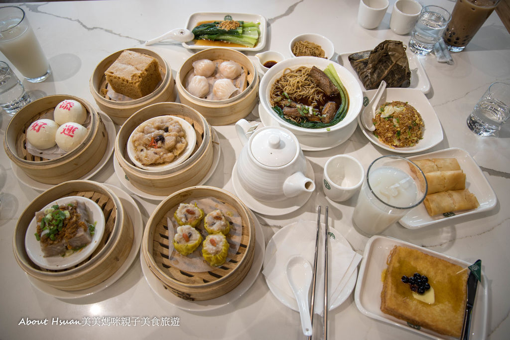 賽螃蟹春捲、豉汁蒸肉排、香蒸芋頭糕、香滑馬來糕、季節時蔬,也有茶品-高山烏龍