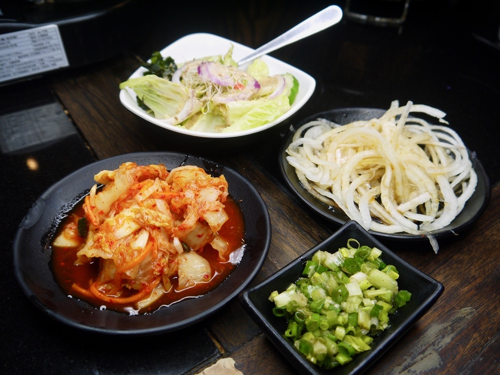 以生菜、泡菜、洋蔥和蔥蒜醬,