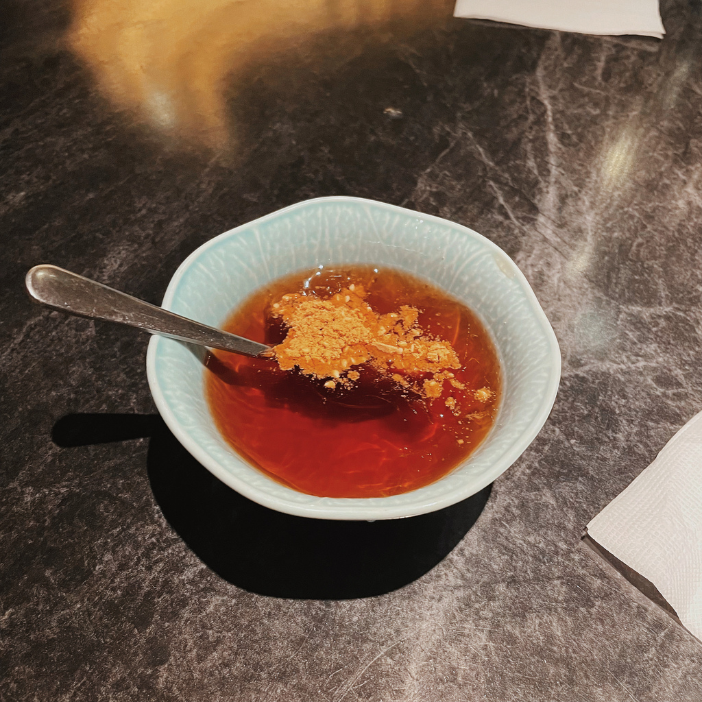 吃完都會有甜點可以吃喔,他是黑糖冰粉上面撒花生粉如果花生過敏的人一定要先跟服務人員說不要加喔,這個味道不會很甜整個超解膩的,感覺可以做個外帶哈哈