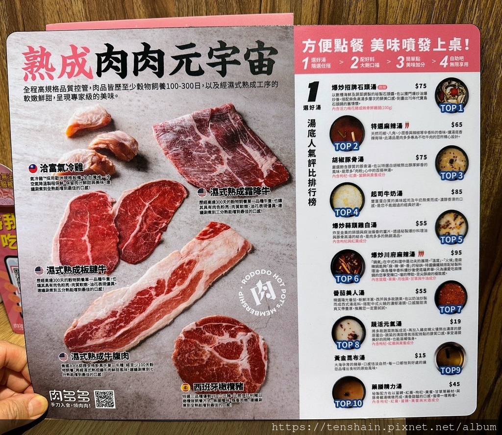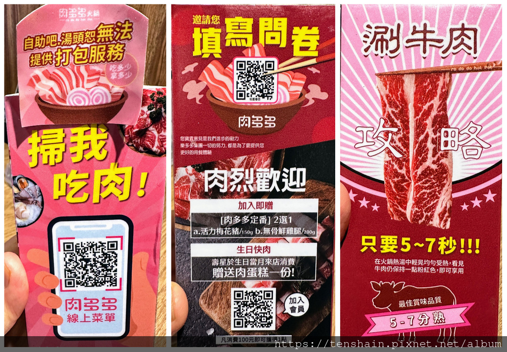 座位上有個三面立牌,「肉多多」現在有線上菜單,掃瞄 QRCODE 就可以看到。還有"涮牛肉攻略",很貼心!不過,最重要的是中間那一張,還沒加入會員的朋友,趕快拿起手機掃瞄 QRCODE ,加入「樂多多 APP 會員」。加入會員的好處很多,包括