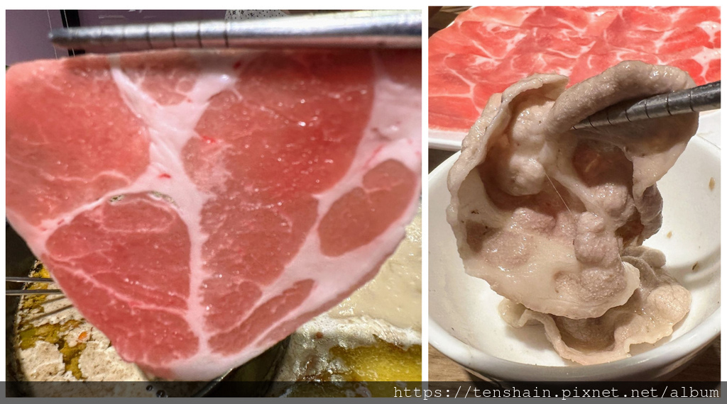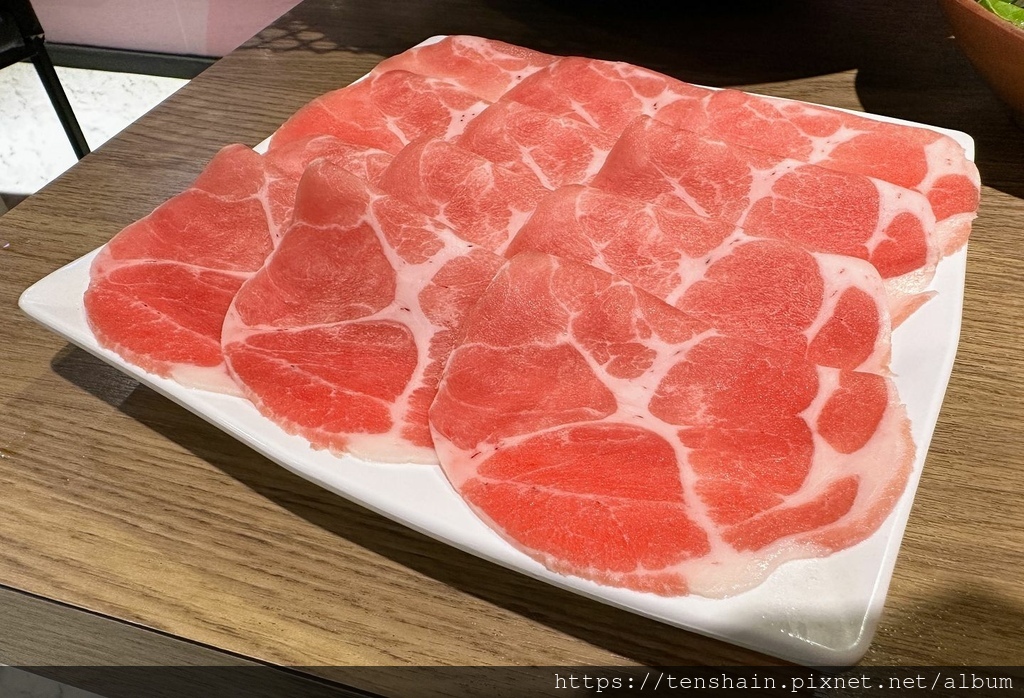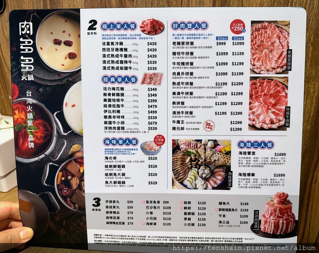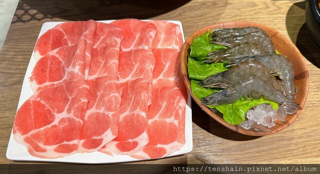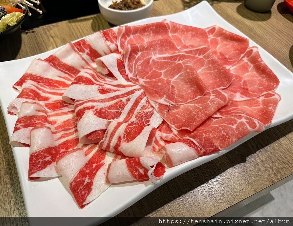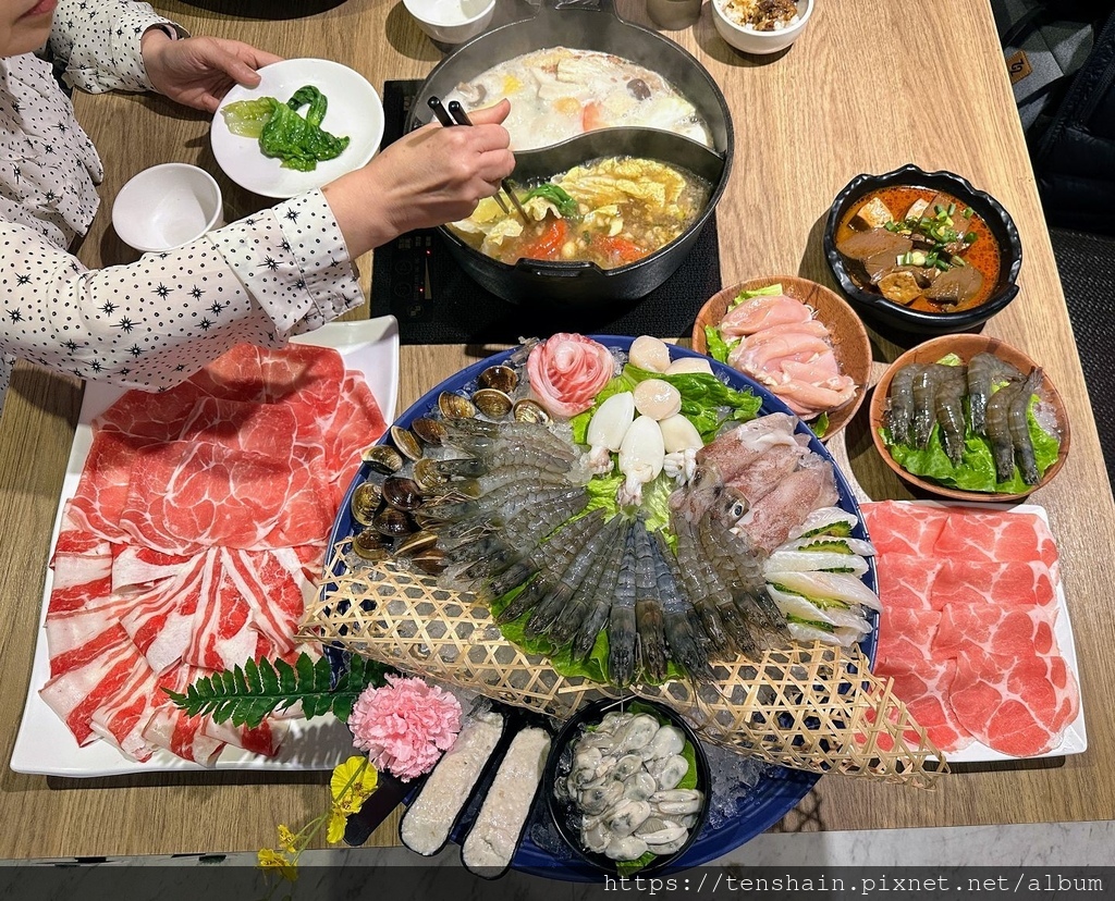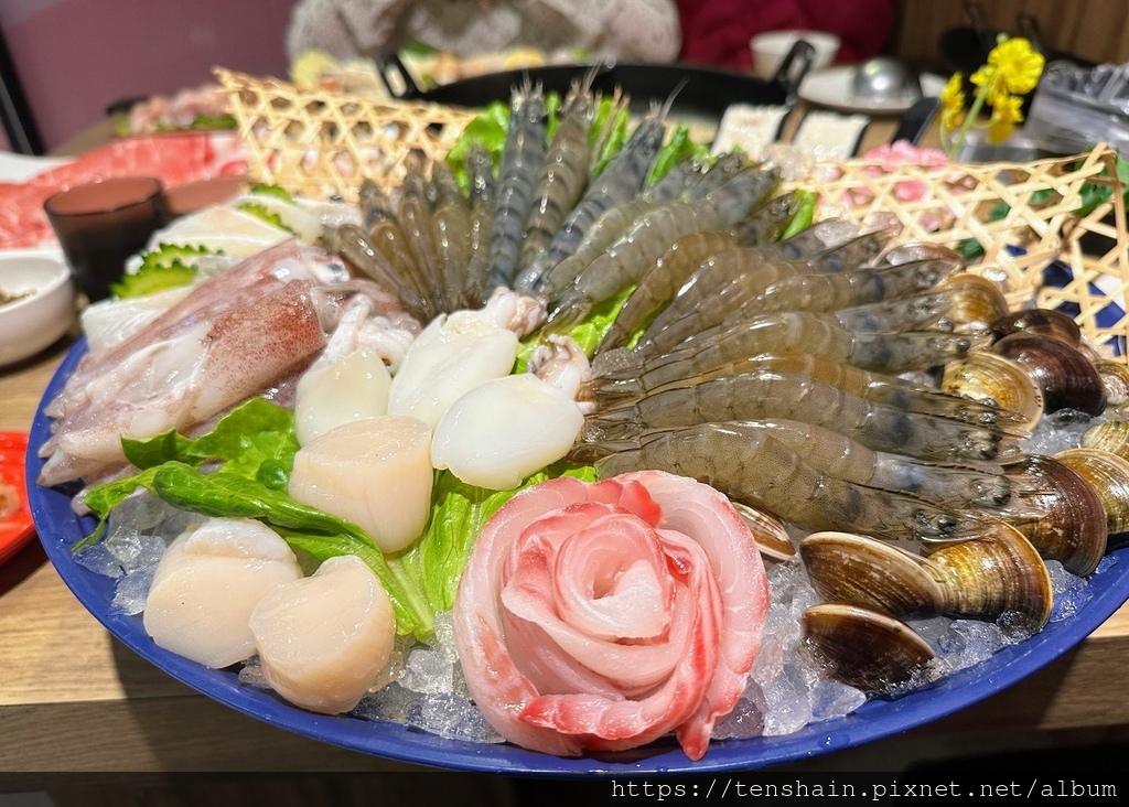 除了"藍鑽蝦、草蝦、小白蝦、鯛魚片、巴沙魚片、蛤蜊、鮮蚵、小花枝、虱目魚滑、小卷、干貝"這些海鮮;還有 17 oz 的大肉盤,內含"美國培根牛+活力梅花豬+無骨鮮雞腿"。