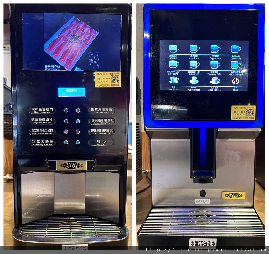 左邊茶飲機的品項也太威了!"現萃蜜香紅茶、現萃歐雷奶茶、現萃蜜香低因紅茶、現萃烏龍青茶、現萃烏龍青奶綠、現萃烏龍低因青茶、巧克力奶茶",簡直是把整間手搖茶飲店搬進來的概念。咖啡機提供十種不同的咖啡選項,愛喝咖啡的朋友應該會很開心。