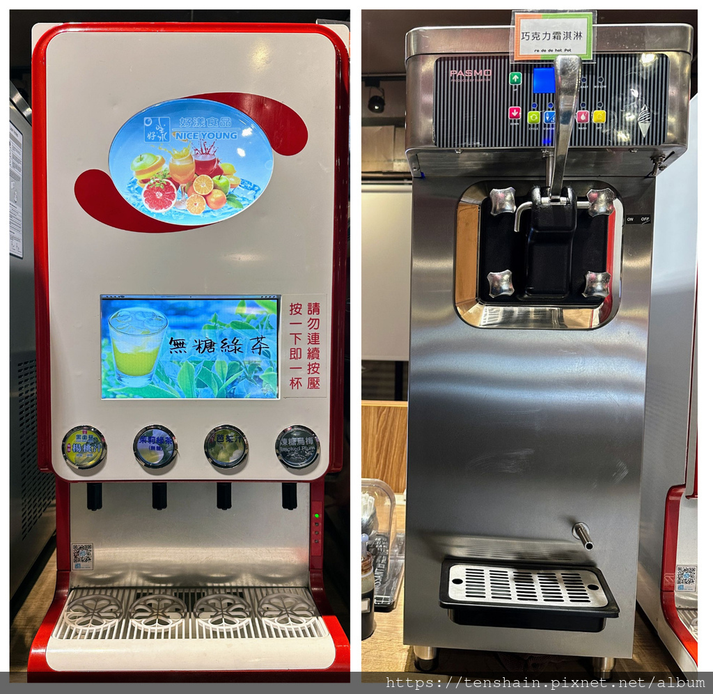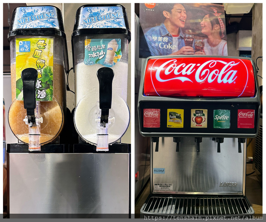 "冬瓜檸檬冰沙"的古早口味,令人開心!"優格思果冰沙"酸酸甜甜的滋味,很開胃!小朋友特別喜歡的碳酸飲料和果汁,就在右邊這台飲料機裡。