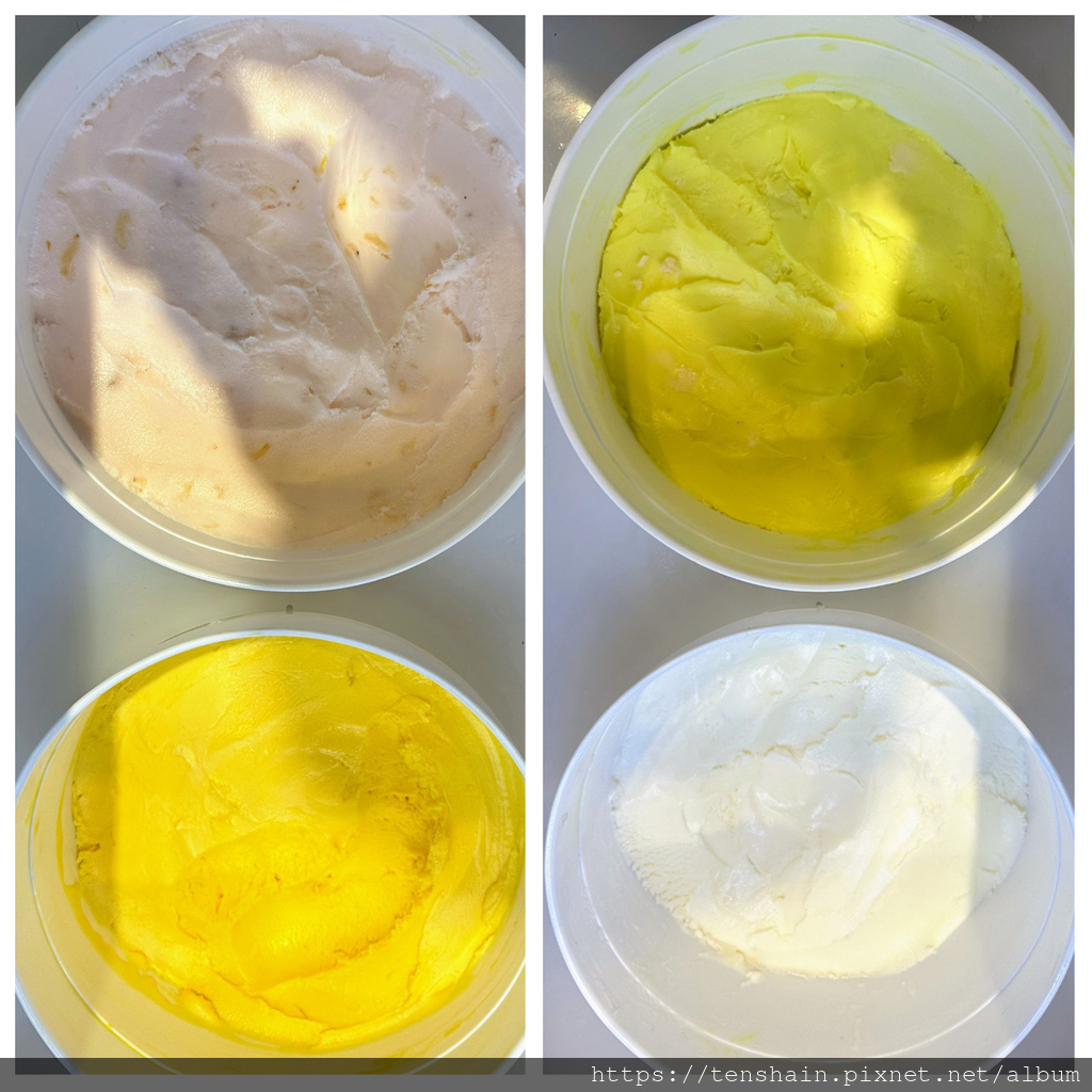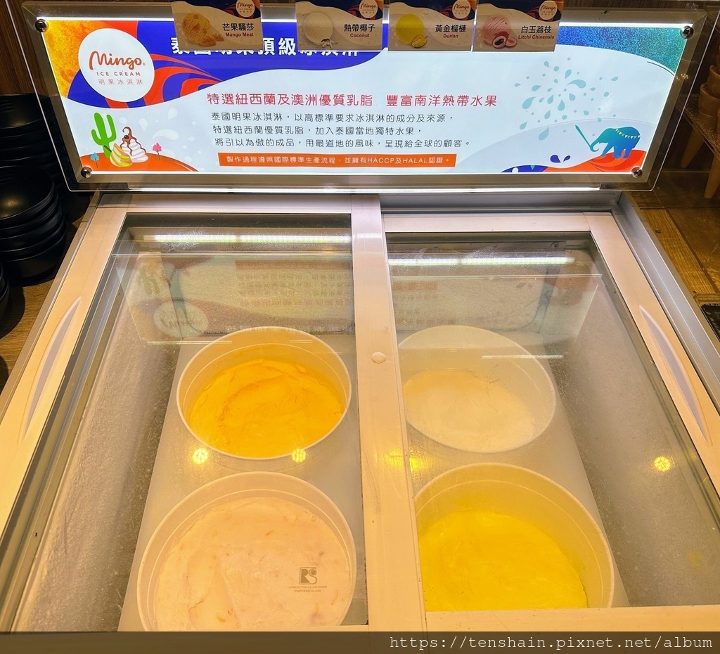 霜淇淋要吃,冰淇淋也不能放過,今天提供的四種口味分別是芒果騷莎、熱帶椰子、黃金榴槤、白玉荔枝。