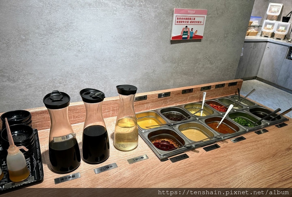 醬料區的種類很多,川府麻椒麻醬、日式胡麻醬、泰式燒雞醬、寶島沙茶醬、岡山豆乳醬、日式檸香柚汁、蔥花、白蘿蔔泥、蒜泥、辣椒、洋蔥、淡口醬油、陳年黑醋、工研白醋、香油...不管你喜歡什麼口味,在這裡總能調配出最適合你的沾醬。