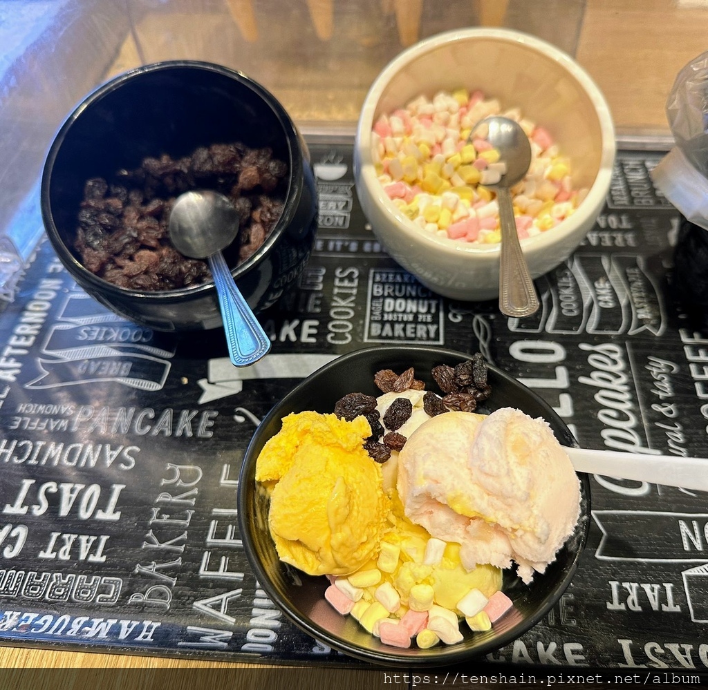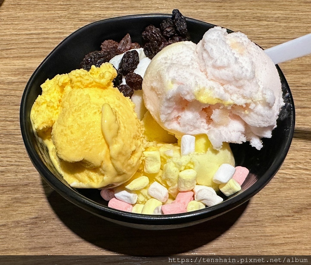 四種口味各挖一球,加幾顆彩色棉花糖球,一匙葡萄乾,如果再淋一些旁邊的黑糖膏 ( 我怕太甜沒有淋 ) ,就是自製的聖代。