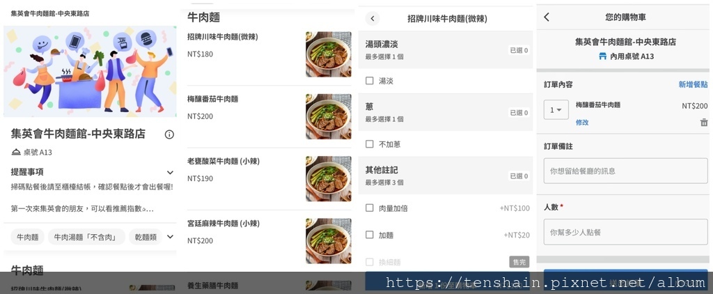 「集英會」的點餐系統做得相當不錯,分類清楚,操作簡單。首先點選你要的牛肉麵品項,再選湯頭濃淡,另外可以勾選"不加蔥、肉量加倍 ( +100元,原本一份5片滷牛腱,加價升級後總共『10片肉』 ) 、加麵( +20元 ) 、換細麵"等。將所有餐加入購物車後,點"查看購物車",這時候在"訂單備註"的地方可輸入您的特殊要求,例如"麵的熟硬度"等。另外要記得輸入點餐人數,因為店裡有免費自助吧,所以每個人有低消 80 元的限制,應該在情理之中。最後按"送出訂單",點餐的程序就完成了!