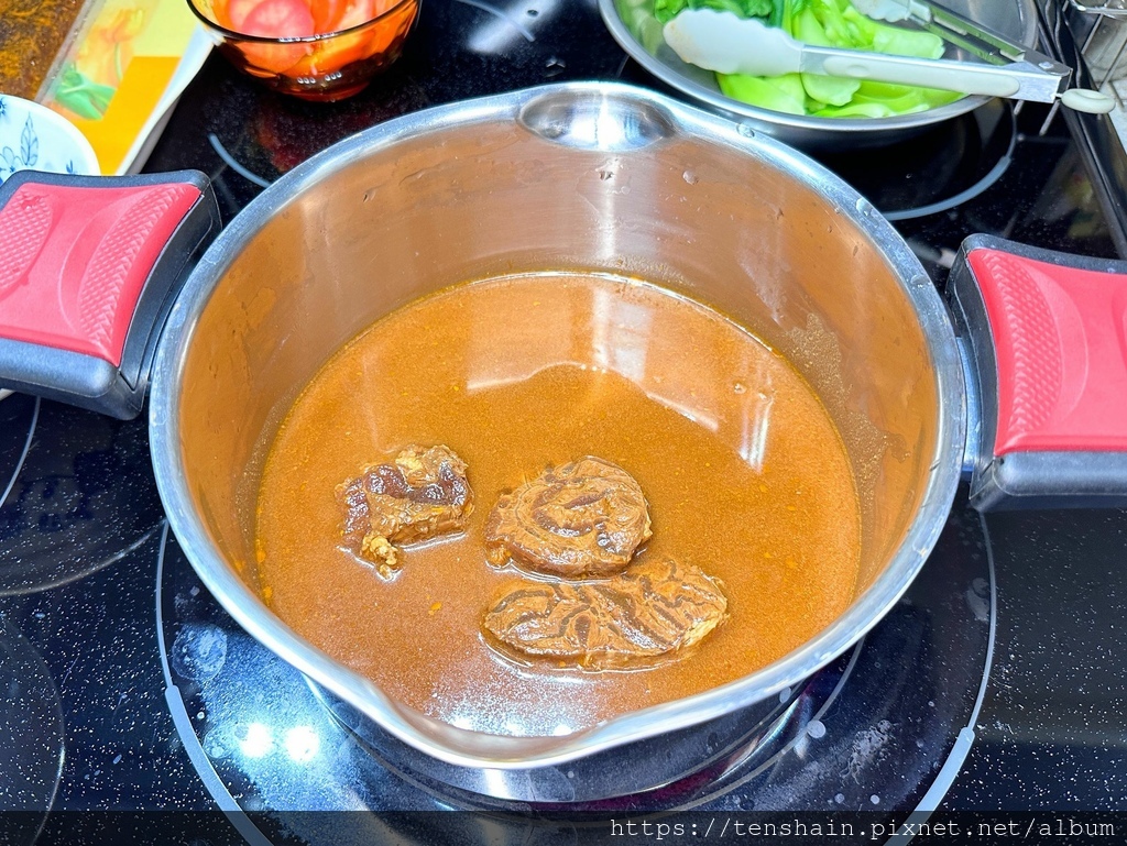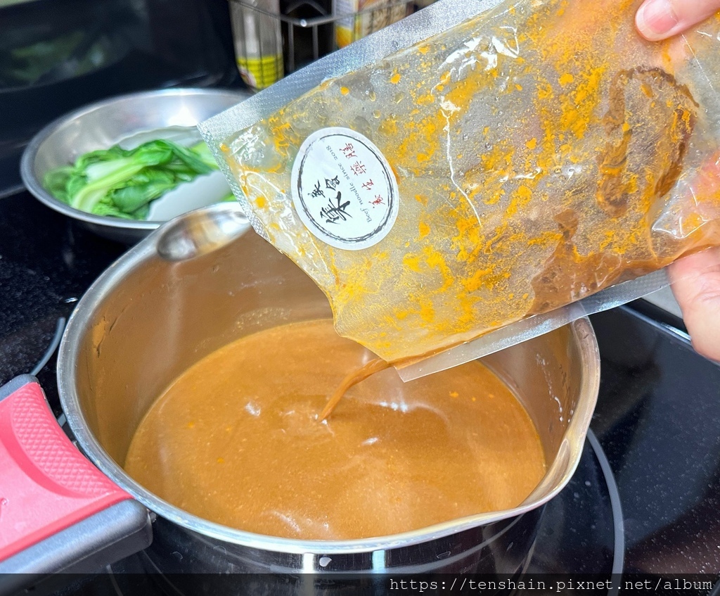 接著將解凍過的牛肉湯包倒入鍋中,開火煮沸即可。