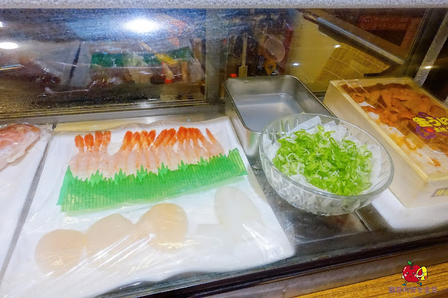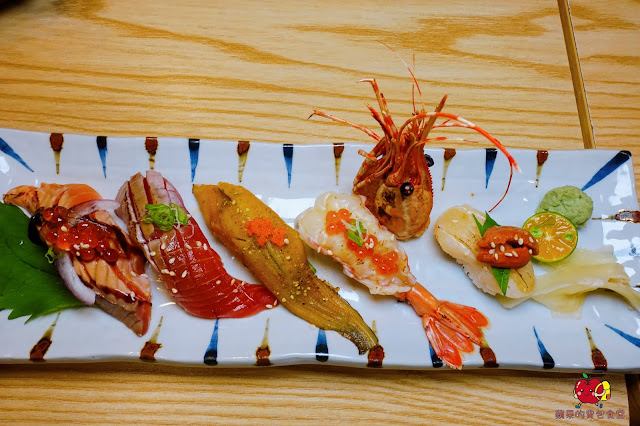 由左至右依序是 豆皮壽司 熟蝦 花枝 海鱺 旗魚 鮭魚親子炙燒