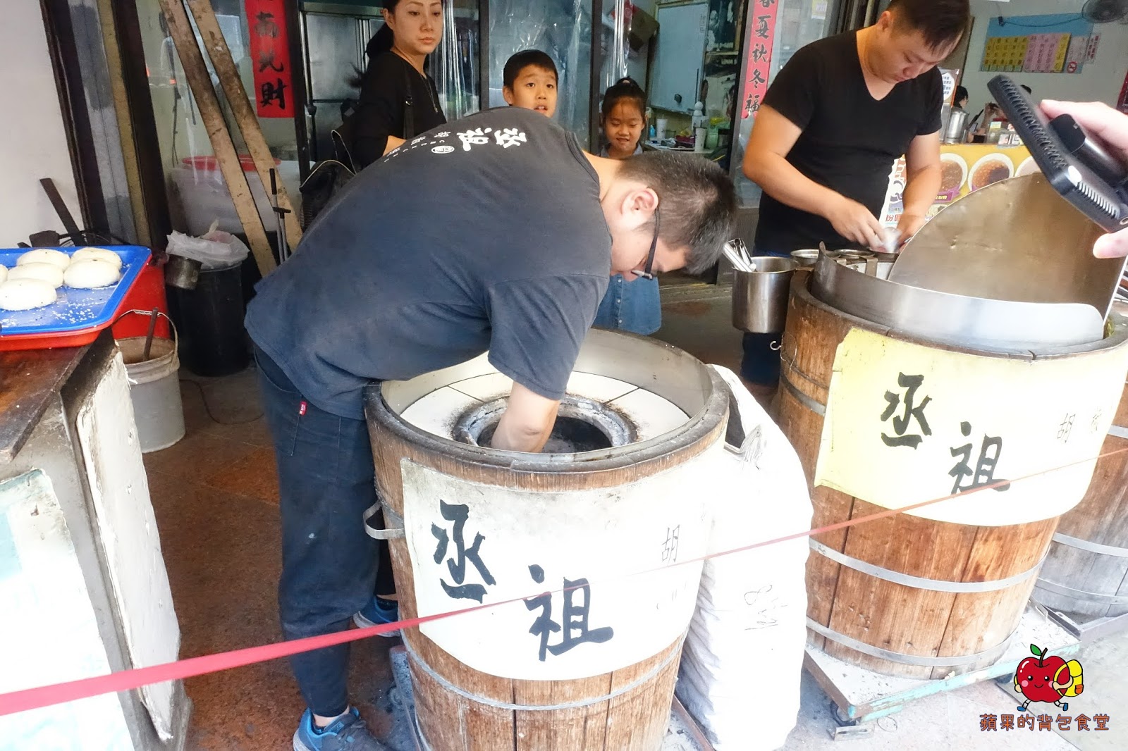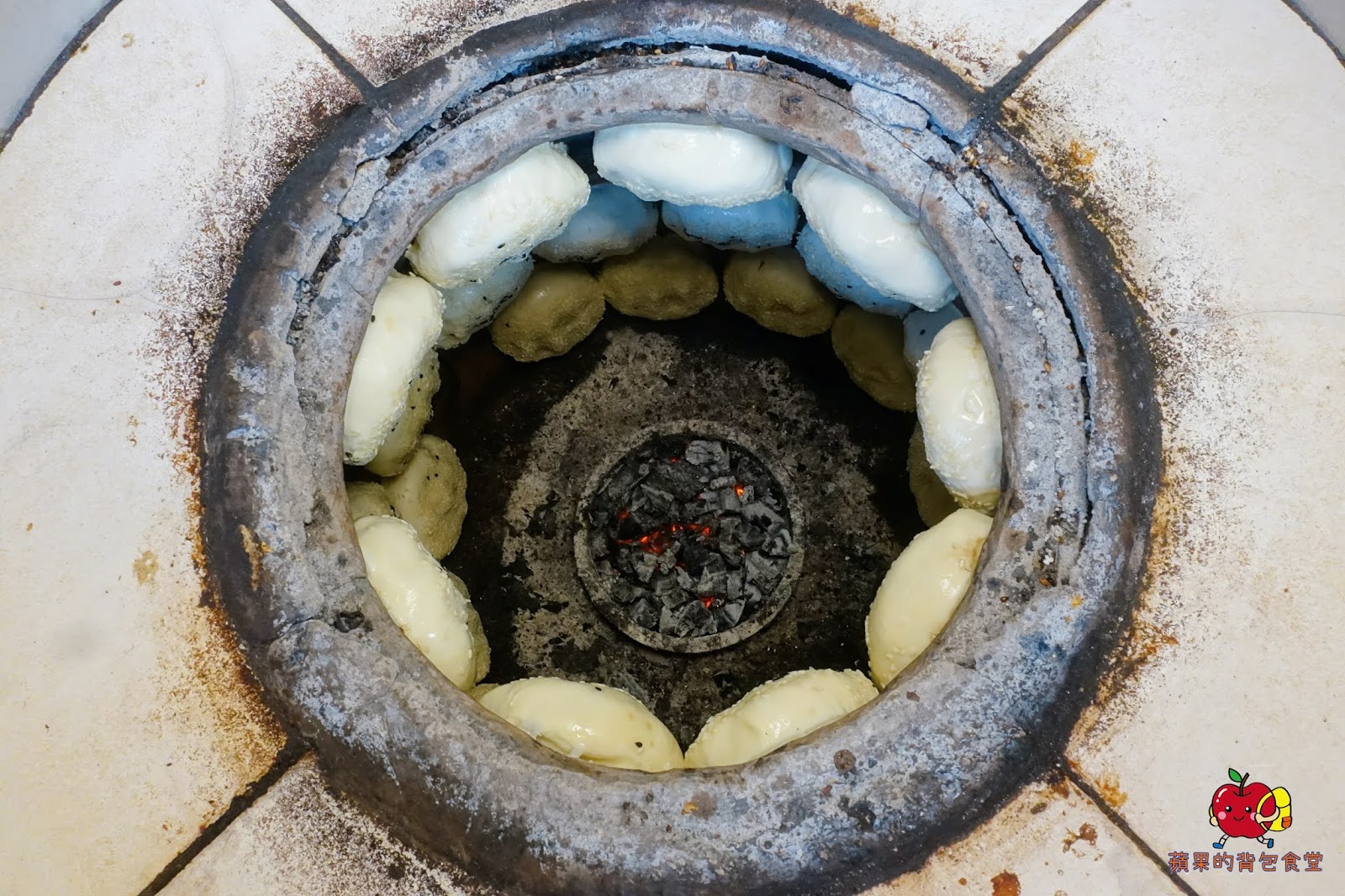 🔺開始把餅貼在爐子壁上了 鐵桶裡是木炭爐火