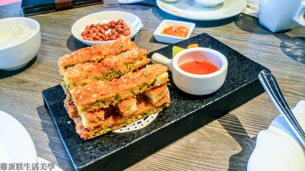 ▲蟹黃海味酥 - 第一眼看到這道菜的創意讓我內心驚呼了一下,這擺盤方式有點像是疊疊樂,表皮炸得非常酥脆,蟹肉棒與蛋黃及特殊香味的蔬菜混合的創新料理,值得一試。