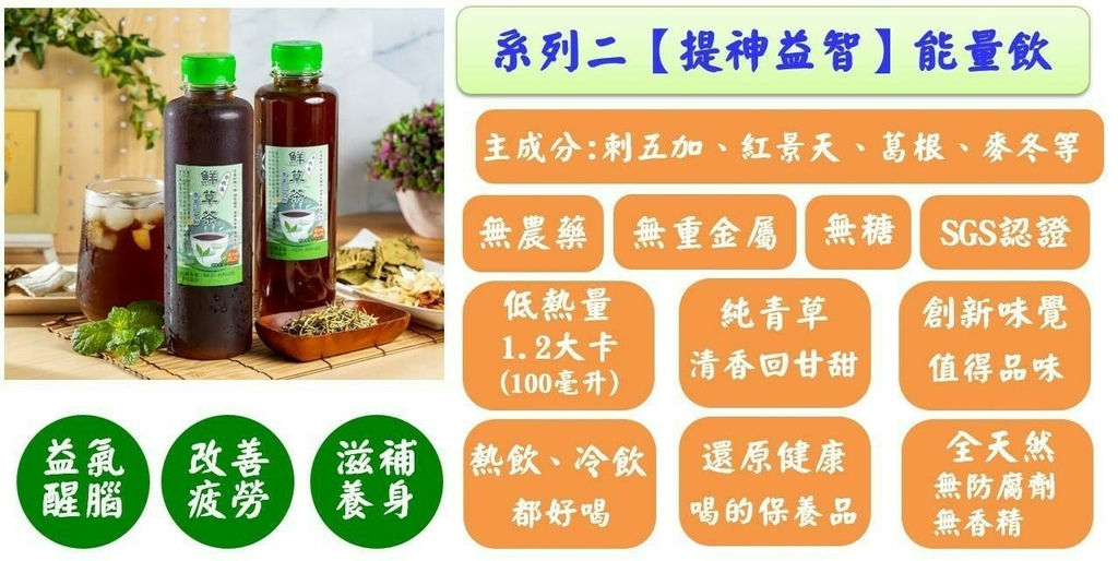 下面是大瓶的能量茶, 丞麒養生飲品(承憶蓮青草茶)的系列二【提神益智】能量飲,富含刺五加、紅景天、益智仁、麥冬,對於考生與工作需要必須大量記憶、高速反應及處理工作的律師/會計師/醫師等,平時可以飲用做為日常保健! 也可以保養專業人士最脆弱的靈魂之窗,因為工作時間很長又非常忙,往往需要在短時間做好工作,晚上又需要與客戶交際應酬,健康當然無法承受日積月累的傷害,健康是買不到的,千萬不要錢在銀行,人在天堂!