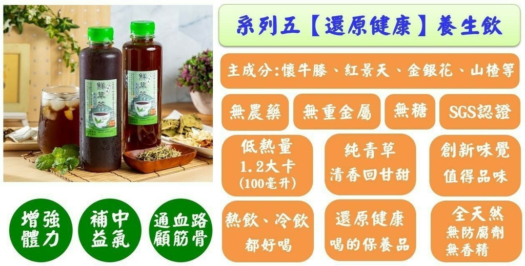系列五【還原健康】養生飲富含懷牛膝、紅景天、金銀花、山楂,幫助消化又延緩老化。