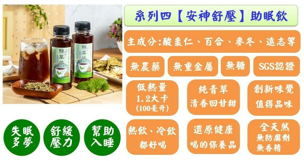 小瓶的系列4助眠飲,對於工作壓力過大的人來說特別要注意可能因為健康不太好,容易變成夜貓,習慣性熬夜不然就是睡眠時間太短(白天要趕著上班),系列四【安神舒壓】助眠飲嚴選百合、麥冬、金銀花、山楂製作,產品皆有經過SGS檢驗合格,睡眠品質最先要好,才不會干擾到白天的工作效率,工作效率一差就容易導致出錯,特別是需要專注力開車的物流業/運輸業,還是無法容許細微差錯的會計業, 現在市面上出現這樣多改善睡眠的保健食品,可見得要好好睡著真的是看似簡單卻很艱難的人生大事,千萬不能輕忽!