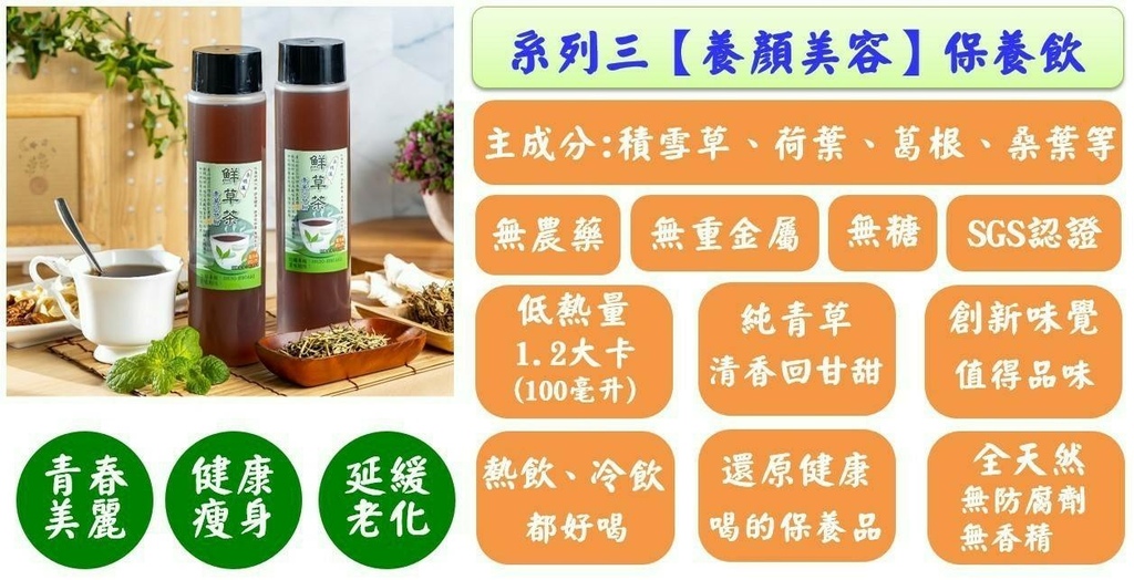 較為小份量的系列三【養顏美容】保養飲富含積雪草、荷葉、葛根、桑葉,對女性朋友非常好,能保濕肌膚來修護肌膚,舒緩皮膚不適,防止老化。如果平時有在做醫美手術改善臉上的缺點時,醫美手術後肌膚會變薄及容易缺水乾燥,非常適合飲用!都說女人是水做的,既然喜歡喝飲料的人改不掉喝飲料的習慣,選擇喝對健康有益處的承憶蓮,充滿幸福與植物純天然的風味,也是市面上較為少見的養生飲,值得大家享用~~