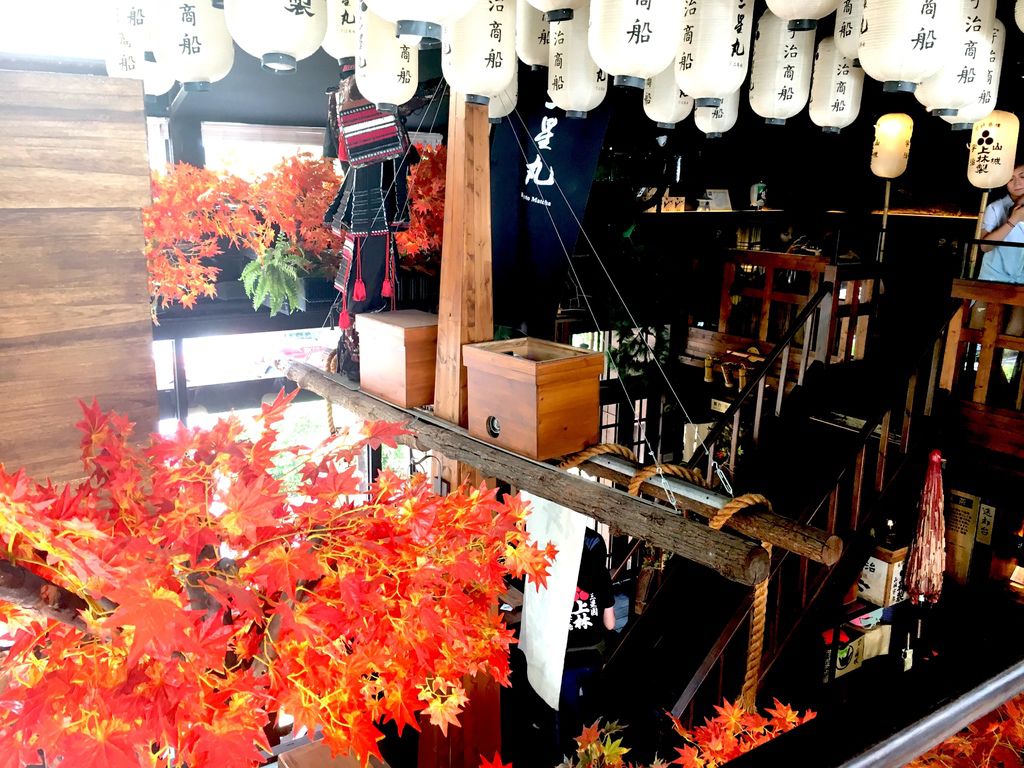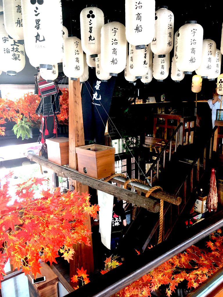 宇治商船 三星丸室內座位不多,這麼熱門的店真的要先預約. 我們的座位在二樓角落,視野很好可以看到中庭的楓樹,也很有隱私. 防邊還有兩個小椅子,馬上把行李甩上去XD 忍了一早上餓到現在就是為了要鹹食甜食都給她點上一份.