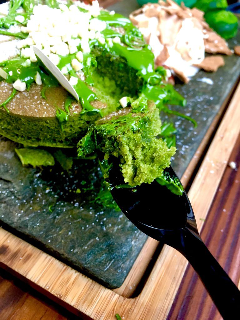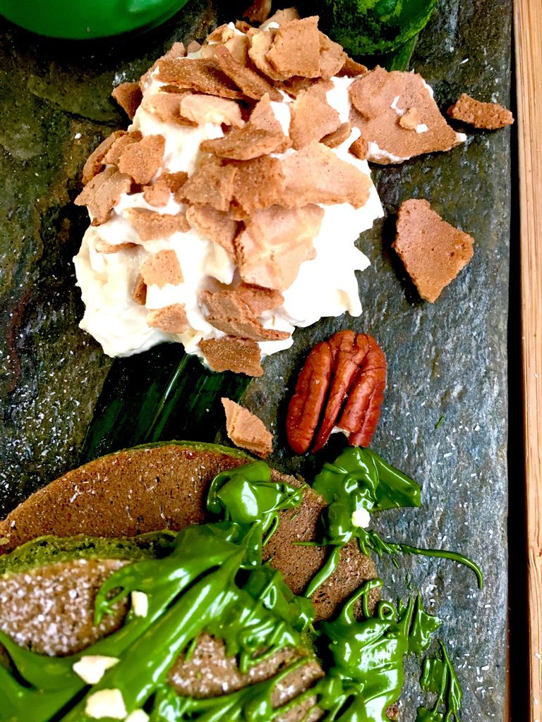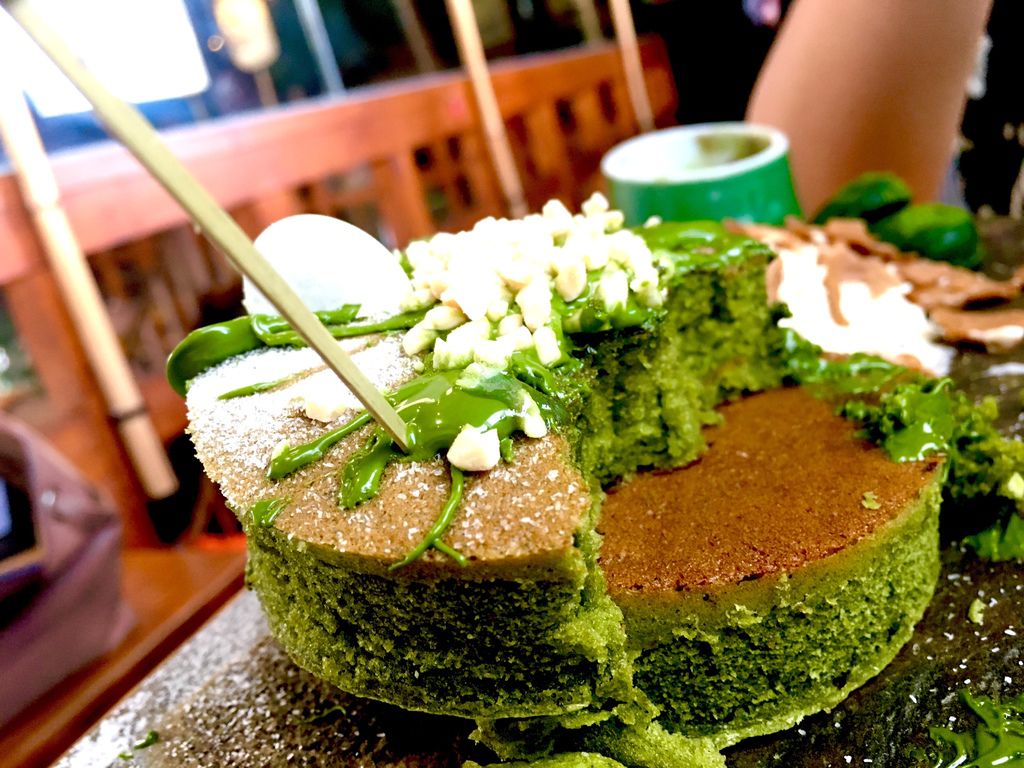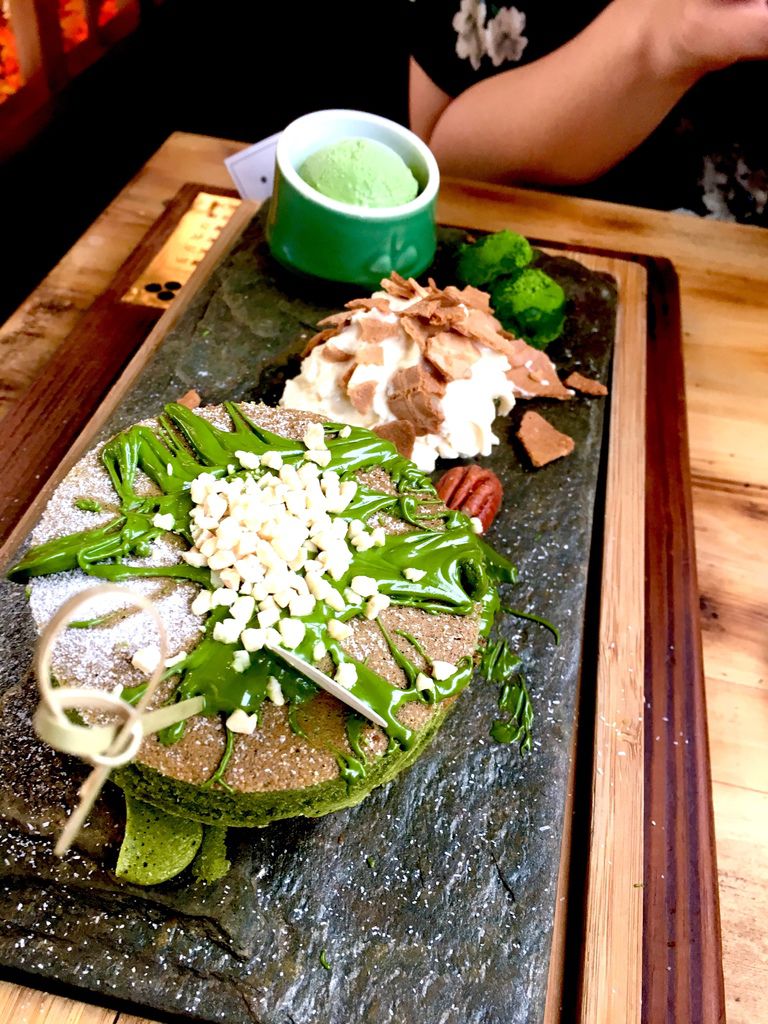 抹茶鬆餅滿紮實的,我喜歡她兩邊煎得硬硬的,中間濕潤,每一口都有濃厚的抹茶香,我原本以為是厚鬆餅類,但說真的啃完飯糰,這樣的份量剛好. 盤子上還有抹茶醬,鮮奶油,餅乾,大家可以發揮創意自己搭配. 而最讓我驚豔的是右上角的那兩顆小小圓圓的...