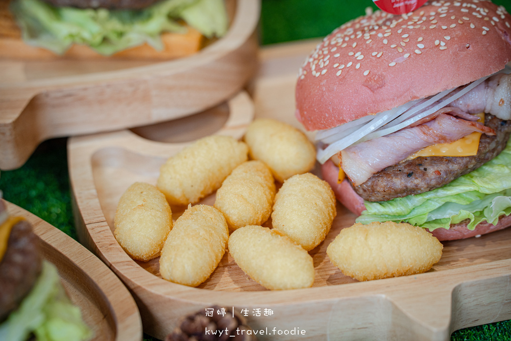 在現點現烤的高顏粉色泡泡好事堡中,抹上香氣迷人的松露醬後,夾入自帶爽脆口感自然甜度的嚴選生菜、增添整體風味的洋蔥絲,夾入紮實有彈性的爆汁和牛漢堡排、鮮香培根、濃郁系起司,搭配可以咀嚼到細緻麵香的好事堡,好~滿足。