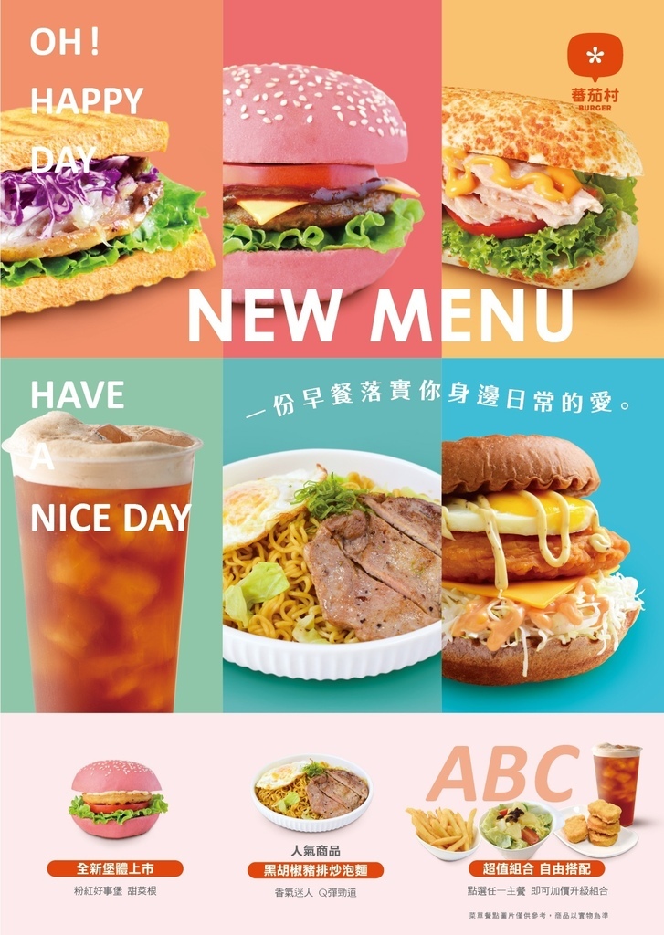 以嚴選優質肉品、繽紛鮮脆時蔬現點現做的多料系平價早餐、早午餐,供應:早午餐套餐系列、磚壓吐司系列、甜壓磚系列、吐司麵包系列、抹醬麵包系列、漢堡系列、樂活堡系列、輕食盤餐系列、義大利麵系列、炒泡麵系列、鐵板麵系列、蛋餅系列、煎烤炸系列等系列餐點,搭配飲料系列、手搖飲系列飲品,提供即時剛出爐的熱騰騰好滋味。