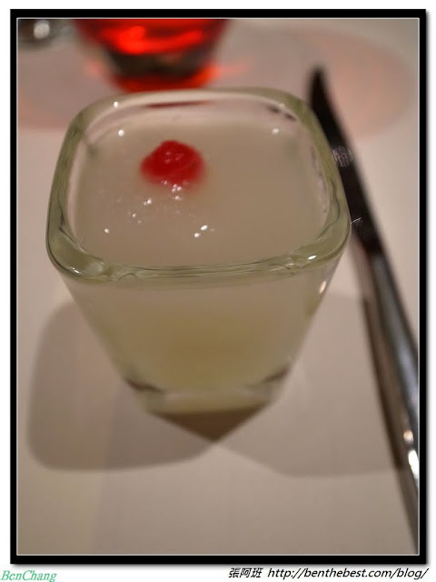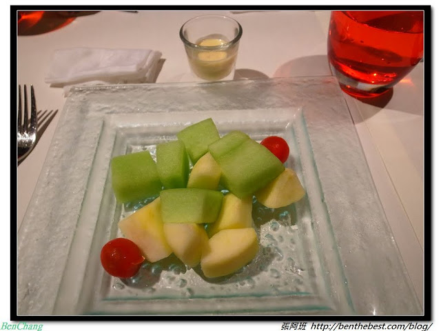 開胃菜的鮮蝦蘆筍味道真的是有些重,不過不像以往是用三小菜盤呈現,而是直接弄成沙拉擺盤式。