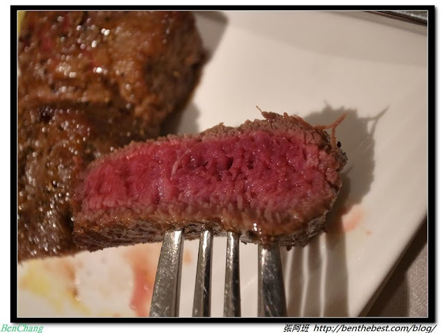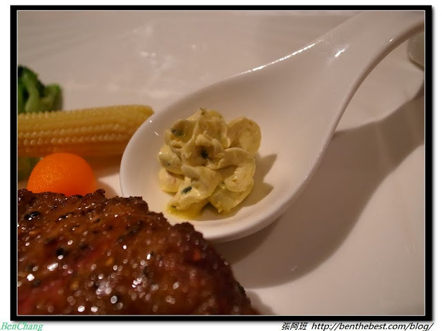 這五分熟的部分是張阿班本身比較原始人的吃法,一般還是建議七分熟是最剛好的。在牛排本身的部分,軟嫩的口感卻帶有扎實的肉質,這是一般多數人最喜愛的口感。味道上因為肉味偏重,建議還是多沾點醬吃,來壓一下味道,不然吃不習慣的人可能吃到最後會有些膩。張阿班的吃法是都以五分熟搭配鹽巴來吃,這種吃法比較適合種肉味的人,嚼感上也會比較韌一些些。順道一堤,旁邊附的(魚味奶油?),味道跟牛排很搭,很適合沾些搭配來吃,會有不同的感受唷。