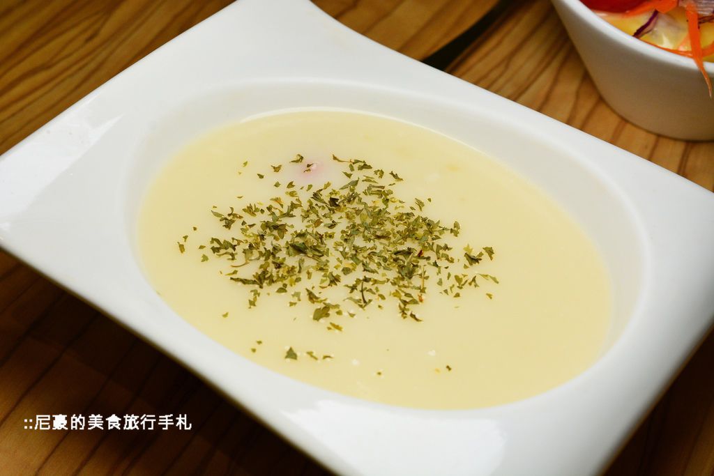 在一邊DIY漢堡的時候,義大利麵的套餐沙拉跟濃湯就上桌囉