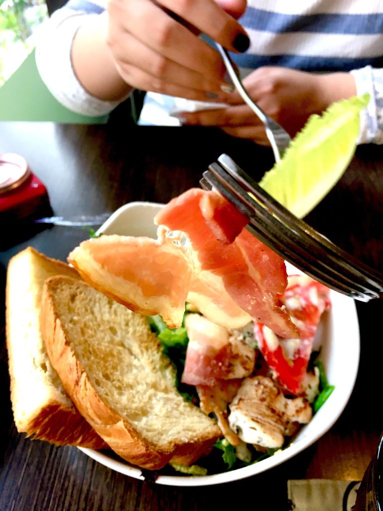凱薩雞肉沙拉好優秀說,烤雞肉和培根都很大塊,帶有一點點香料,蔬菜都是我愛的,新鮮又多汁,忍痛割捨兩塊麵包,不然真的會沒空間裝厚鬆餅。