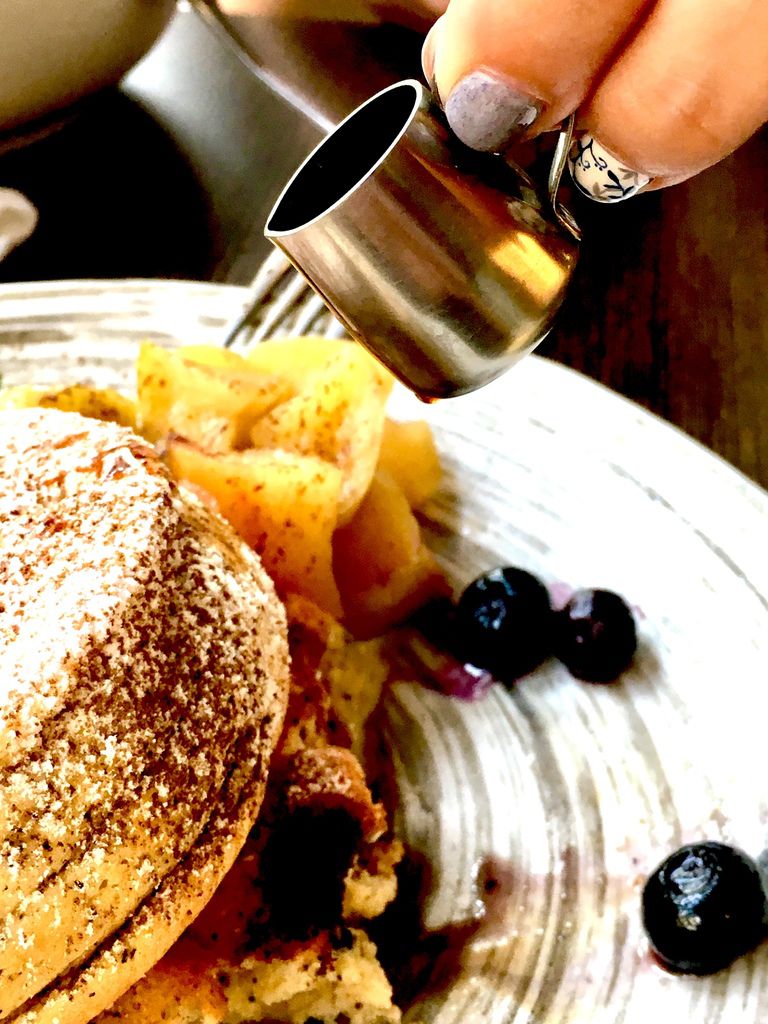 有蜜蘋果、楓糖、冰淇淋和鮮奶油搭配出不同的層次,每種食材都保留自己的香氣,一盤厚鬆餅可以玩出這麼多變化,增加下午茶的樂趣。