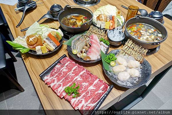 出雲鍋物的排場,先到先點不等了,我肚子餓的要命,這是燒酒雞鍋跟卜卜鍋的排場,干貝跟海鮮盤是另外加點的。