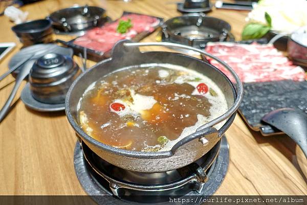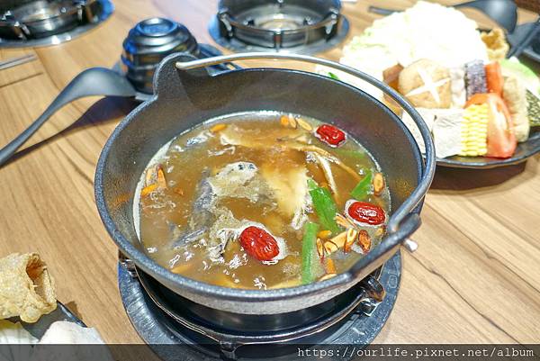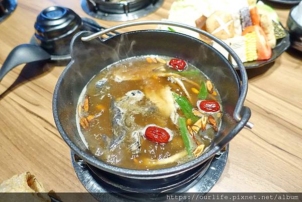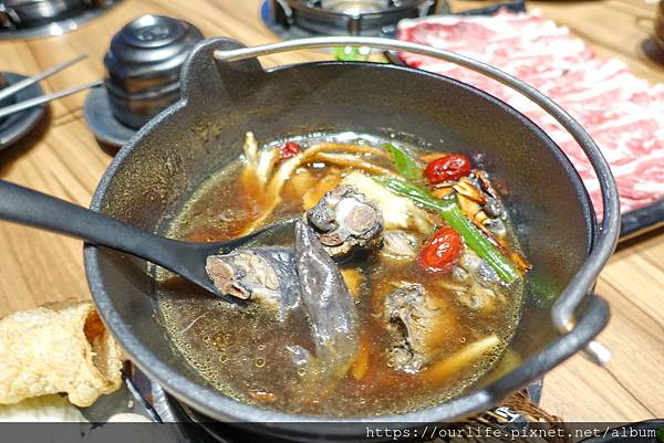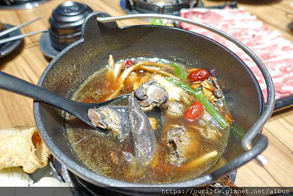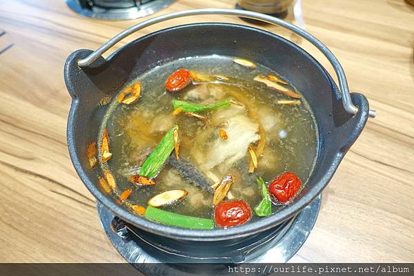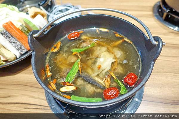 出雲鍋物的燒酒雞很特別吶,裡頭有很多中藥材,雞湯顏色還滿暗沉的,其實這一鍋在點時是點全酒要燒,我有先問有沒有燒?出雲鍋物說會在廚房先幫忙點火燒,我說先不要燒,上桌之後再燒,我要親眼看見它燒,是不是全酒我要親眼看它燒我才願意相信它是全酒,所以我們這一鍋是上桌後才點火燒。