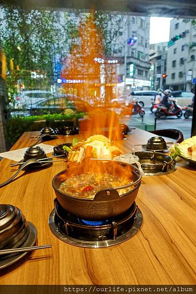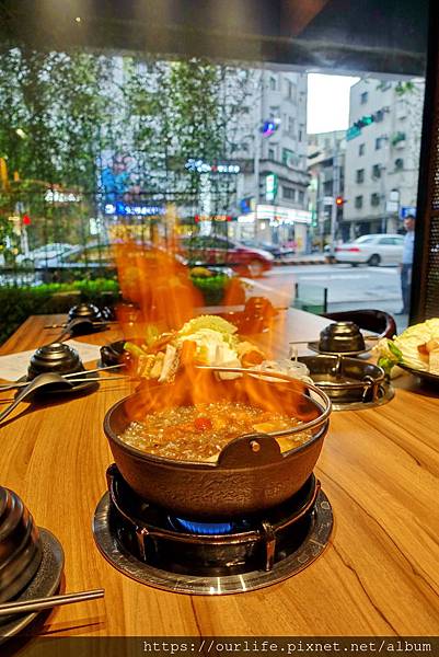 出雲鍋物燒酒雞點火燒的模樣,朋友真的是膽小鬼,這火一點,朋友還有店員都嚇到,唯恐被火燒到,朋友還一直叫我後退一點後退一點很危險,姐儿是水裡來火裡去的女漢子,環境安全情形之下燒酒雞放火燒的危險性很低,所有人都跑走,唯獨我留在桌旁拍照錄影,我燒這一鍋時還吸引不少路人駐足停看哩,這也算是變相的廣告對吧?!
