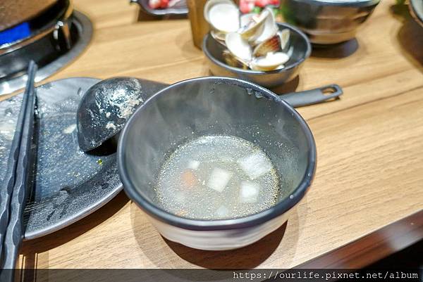 出雲鍋物賣的東西,店裡頭的鍋都很有意思,出雲鍋物的鍋因為太特別了,所以湯也沒有統一一種湯種,這一點我喜歡,蜆湯/雞湯/客家豆皮湯,3種截然不同的湯頭,湯沒辦法共同使用。我在點時我有問,我們點了3鍋,燒酒雞鍋/卜卜蜆鍋/客家豆皮鍋,然後再加點海鮮盤。