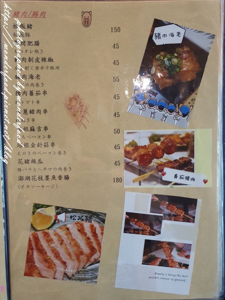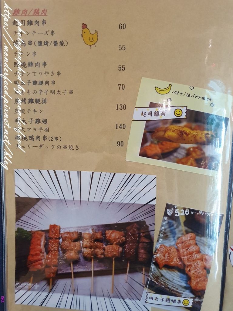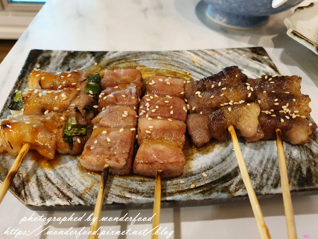 牛肉剝皮辣椒串 45元/串、櫻桃鴨肉串 90元/2串、青蔥豬肉串 45元/串