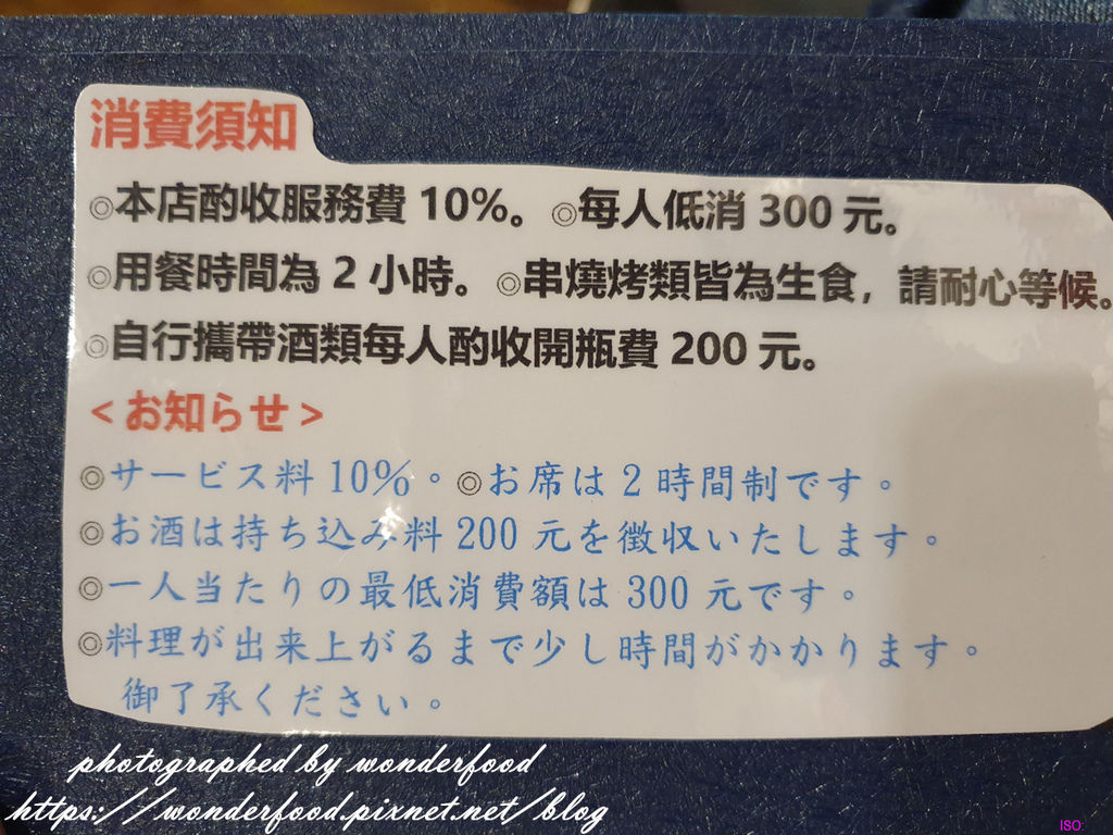 酌收服務費10%、每人低消300元、用餐時間2小時、自行帶酒酌收開瓶費每人200元
