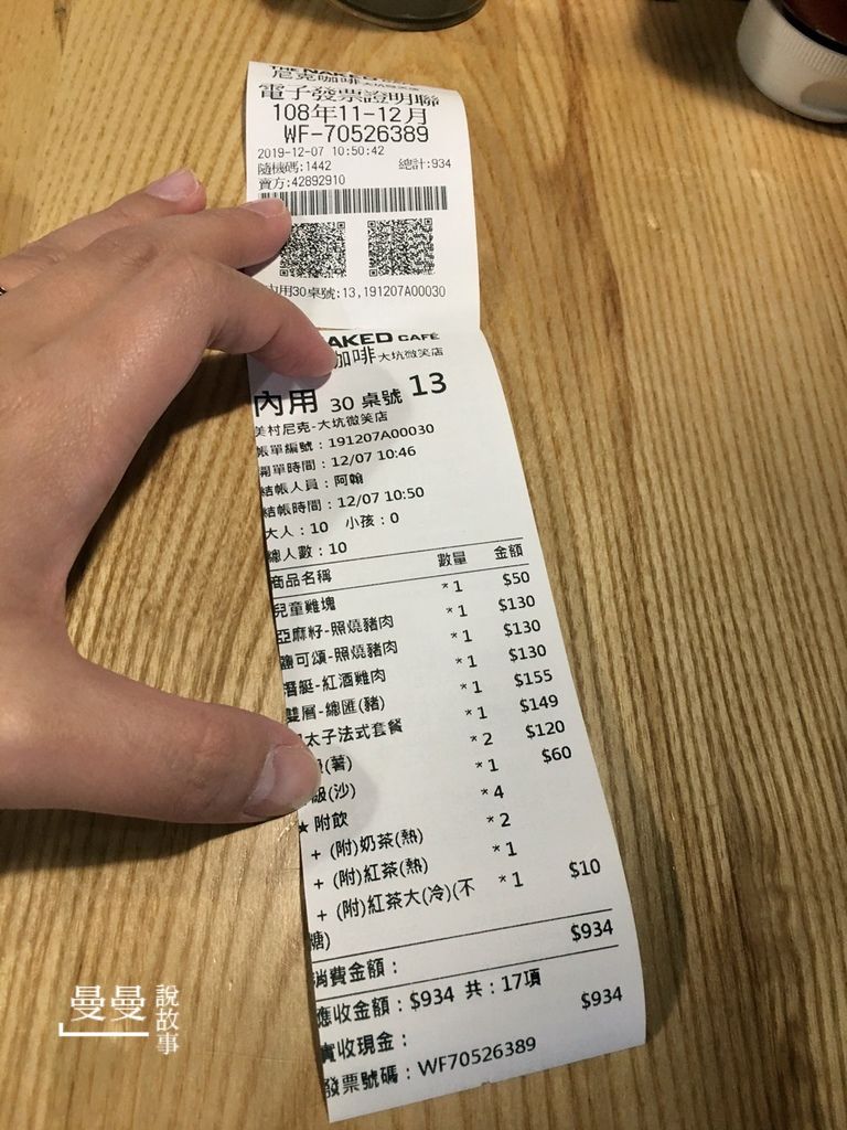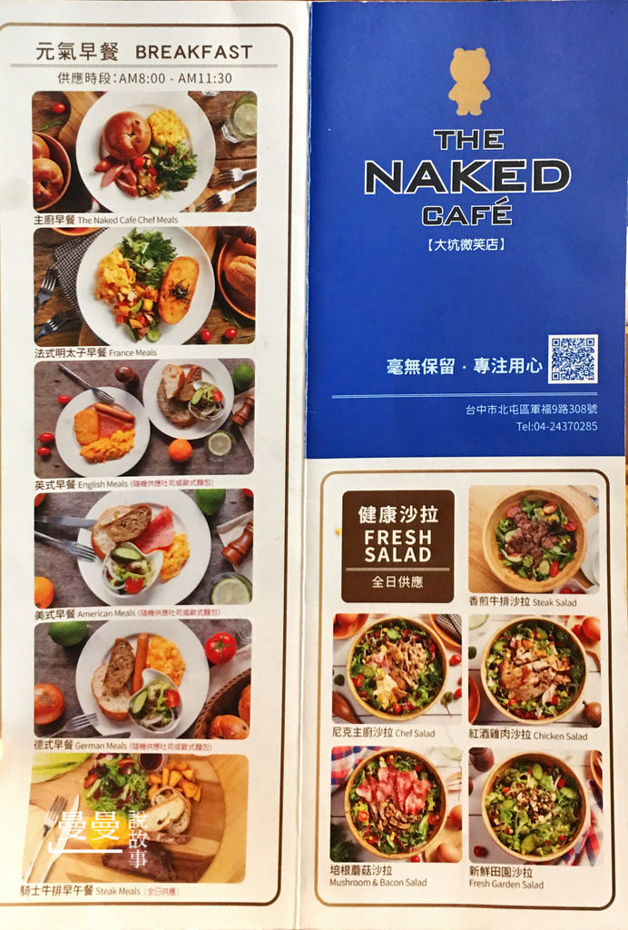 這大概是我最快出食記的一天 真的覺的餐點好吃,環境美、免收服務費、無限時用餐,更重要好停車 光是這些優點就想推薦給大家 唯一小小的缺點,建議直接吃午餐,餐點卡澎派,文末有菜單喔 吃早餐沒有飽的感覺耶(掩面)我是大食怪 【尼克咖啡(微笑大坑店)】 電話:(04)2437-0285 地址:台中市北屯區軍福九路308號 https://m.facebook.com/TheNakedCafe/ 店裡面有兩隻超大熊熊,每個小孩子看到幾乎都不用口令的一致往前擁抱 聖誕節到來,店內也多了許多應景的布置 直接給大家快速看一下店內環境 用餐區其實蠻寬敞的 冬天裡的陽光很溫暖,但曬久也會很熱 覺得不分季節都適用的布置小物 今天聚會主要是朋友相會閒話家常,廢話不多說,直接看大家手上的早午餐 照燒豬肉鹽可頌麵包 $130元 照燒豬肉聽朋友說口味很重,比較適合大人 照燒豬肉亞麻籽麵包 $130元 室友點的紅酒雞肉法式潛艇堡 明太子法式套餐 $149元包含一杯飲料 上頭的滑蛋挺不賴的,兩個小孩很捧場 生菜淋上醬醋很開胃,搭配的小配菜為番茄基底,不過份鹹度,不搶明太子焦點很好 塗抹的明太子的法式麵包口感偏鬆軟類型,感覺跟潛艇堡的麵包是一樣種類 吃完只有滿滿的空虛...只差沒有短起盤子舔一舔 加點給小朋友的雞塊 50元 50元5個,媽媽都想回家炸雞塊了XD 後方的薯條是點手作麵包系列早午餐2份的份量 只要加價60元/份就能升級為組合套餐,套餐組合附薯條或沙拉(2選一)及一杯飲料 總消費金額只能說超便宜的,6個大人4個朋友(嬰幼兒階段) 對於這樣可以暢所欲言不限時間的場所,餐點又好吃的地方,停車又方便 真的可以列入下次聚餐首選 下次聚餐我一定挑午晚餐下手,別桌上菜的餐點看到快流口水... 菜單分享 ◎歡迎追蹤更多▶曼說故事◀好文章唷◎ 本文同步發表於:【台中】The Nakes Cafe早午餐(大坑微笑店),餐點美味、免收服務費、無限時用餐(內有菜單)