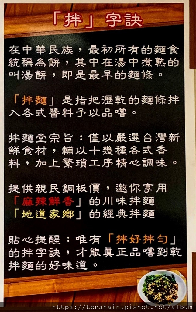 因為昨晚和幾十年沒有見面的南一中同學聊得太晚,所以今天起床已經十點多了。匆匆整理一下,退了房,就和老婆直奔逢甲夜市而去。在逢甲夜市,中午就營業的店家不多,走著走著看到這家拌麵堂,看起來蠻新的,而且冷氣開放中,環境也很衛生,符合我喜歡店家的基本條件。加上我又是麵點的愛好者,所以我們就決定把拌麵堂當成今天的早午餐來吃啦。